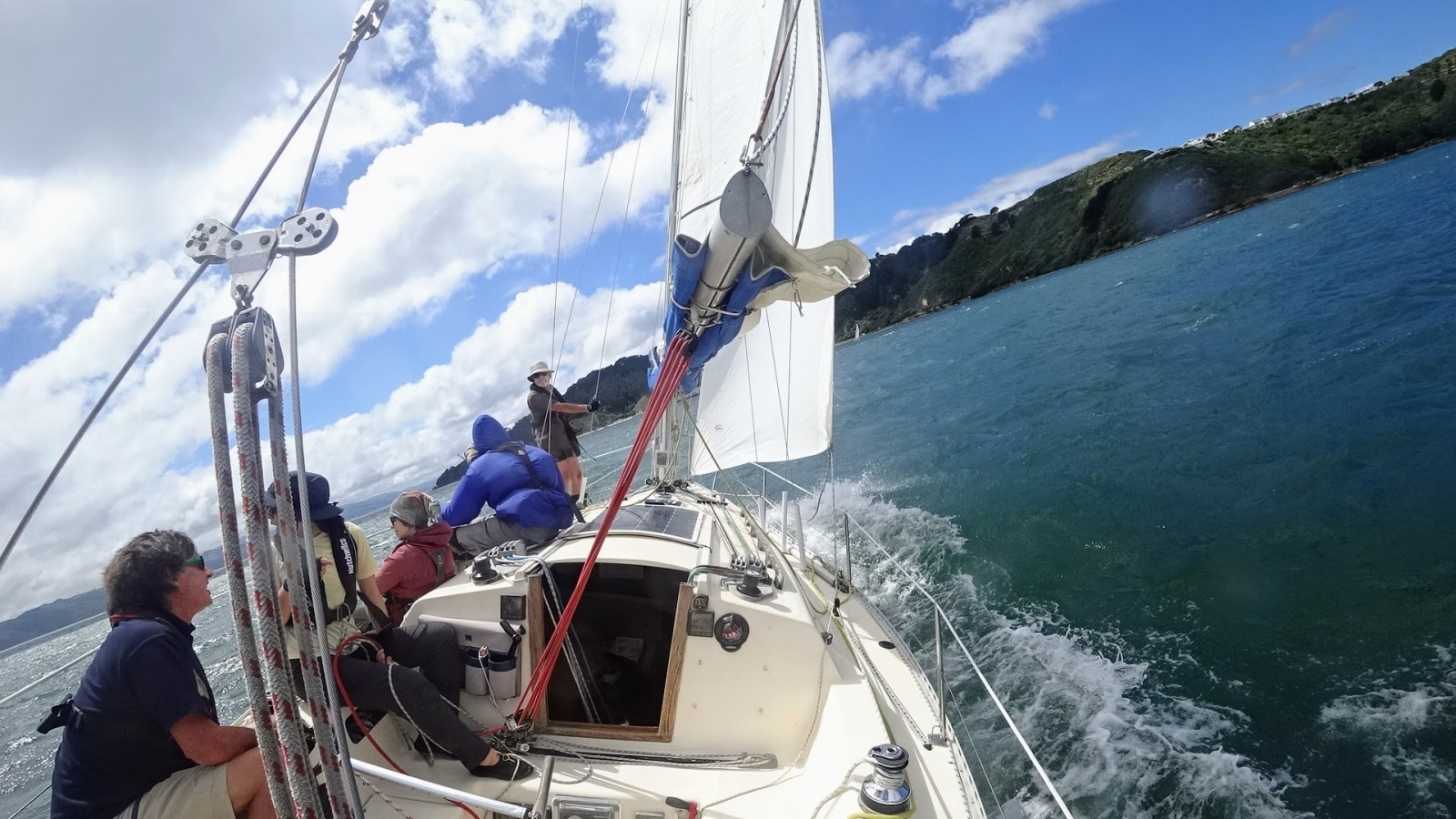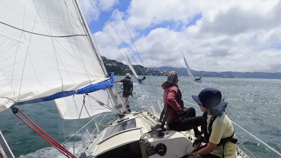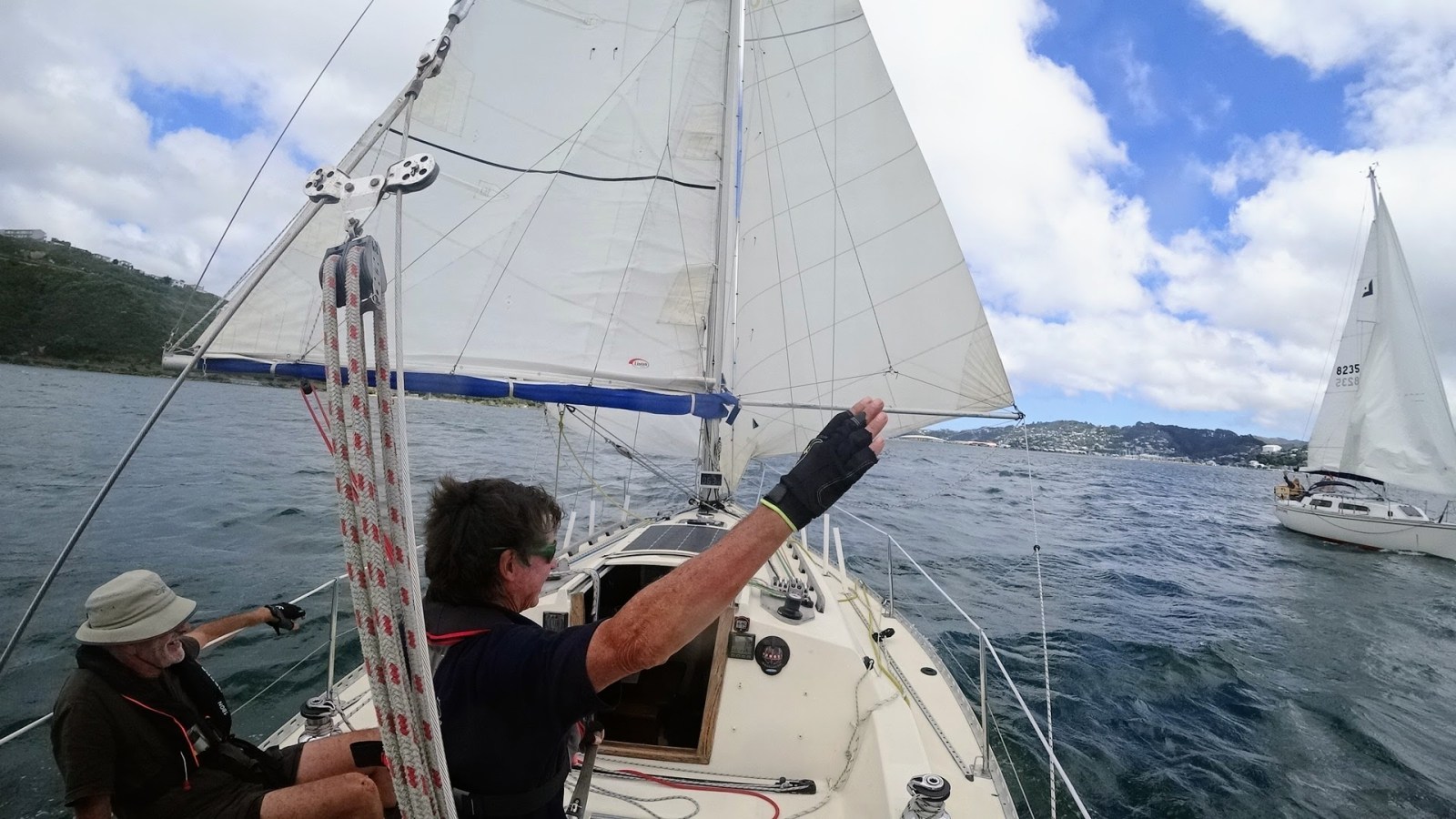 We cast off from the berth at Chaffers Marina at 1108 hrs and hoisted the mainsail with #1 reef and the No. 2 Jib. We did some practise sailing around to Evans Bay before tying up at the wharf. At the clubhouse we got the course for the race: Start – #4 Ngauranga – #5 Somes – #11 Korokoro – Finish. After a cup of tea with Anastasia’s yummy chocolate, we cast off from the wharf at 1242 hrs and hoisted the sails. Grant on bow, Nina and Anastasia on sail trim, Patricia on mainsheet and Geoff on helm.