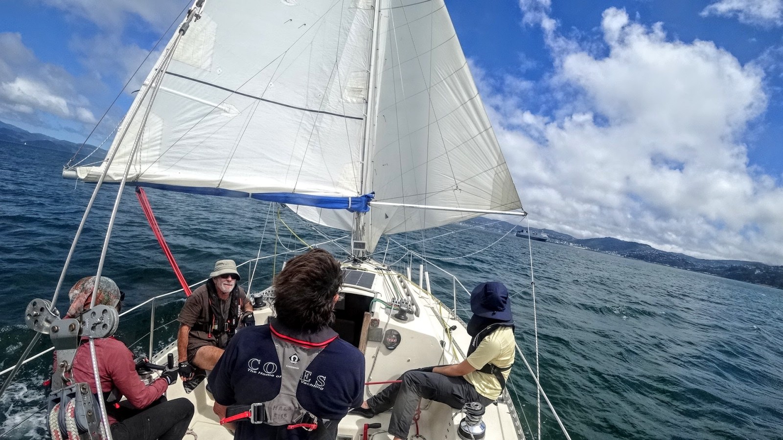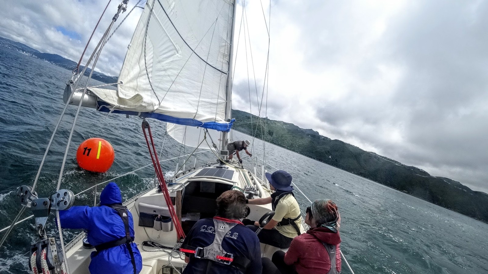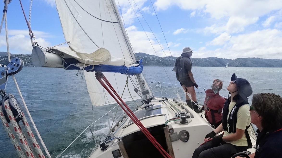 We cast off from the berth at Chaffers Marina at 1108 hrs and hoisted the mainsail with #1 reef and the No. 2 Jib. We did some practise sailing around to Evans Bay before tying up at the wharf. At the clubhouse we got the course for the race: Start – #4 Ngauranga – #5 Somes – #11 Korokoro – Finish. After a cup of tea with Anastasia’s yummy chocolate, we cast off from the wharf at 1242 hrs and hoisted the sails. Grant on bow, Nina and Anastasia on sail trim, Patricia on mainsheet and Geoff on helm.