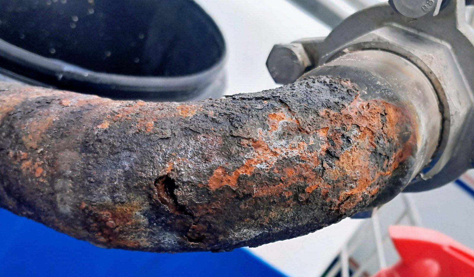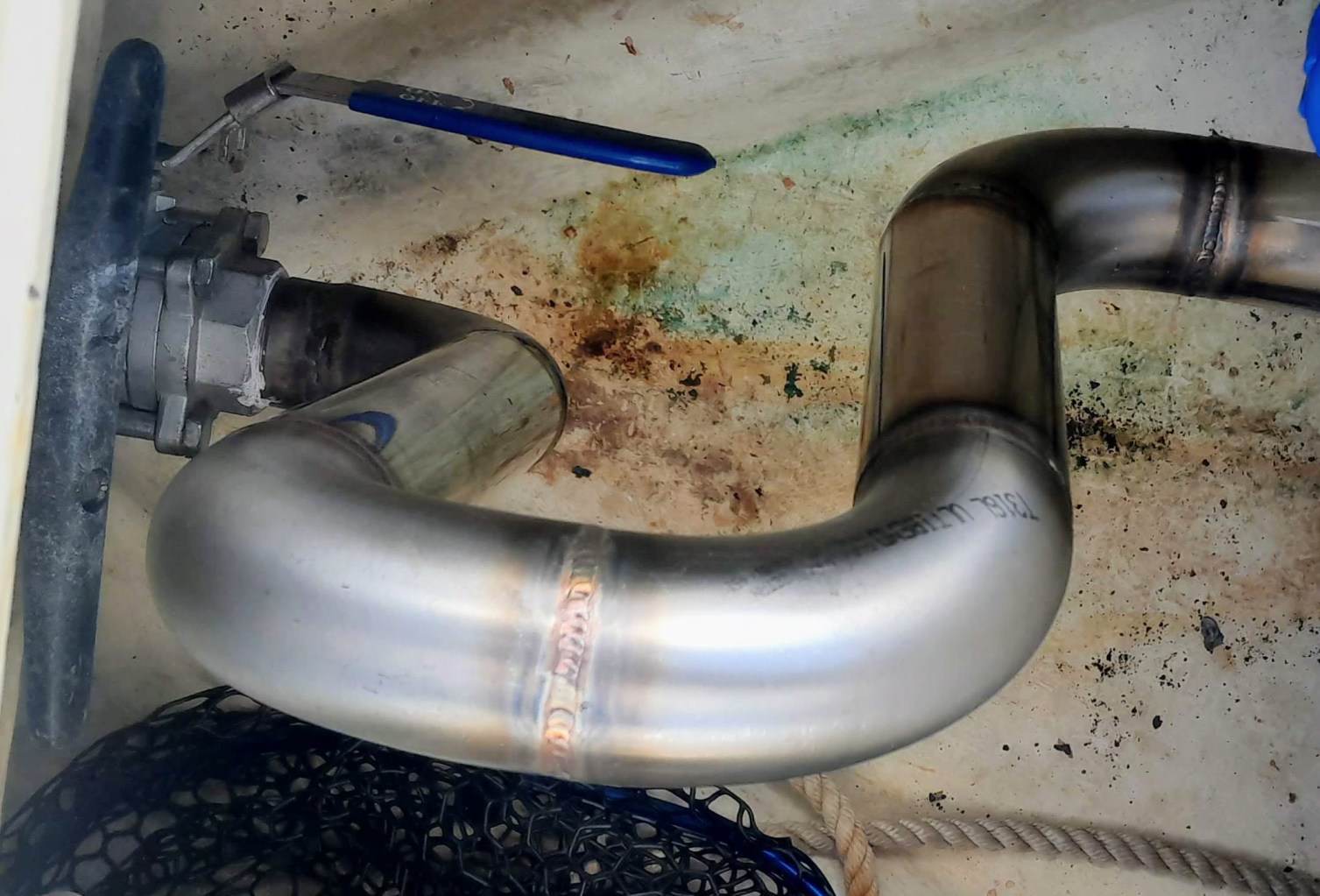 While working on this we also noticed that our old engine exhaust pipe had started leaking water into the lazarette. On further inspection we discovered it had rusted through at the bottom. Rather than repairing it again I contracted TS Marine to fabricate and install a nice new stainless steel unit.