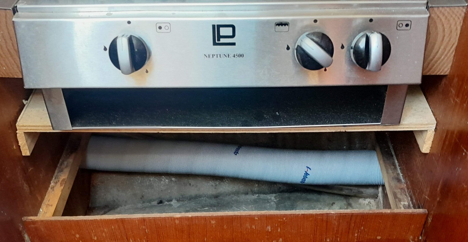 Isaac from TS Marine did a great job of installing the heater. We put the main unit with its 10 Lt fuel tank in the lazarette locker in the stern of the boat well away from the cabin. We ran the air duct through the sail locker and under the stove to an outlet under the dining table. I helped with the electrical side connecting it up to a 10 amp breaker on the main panel. We installed the remote control next to the radio for easy access.