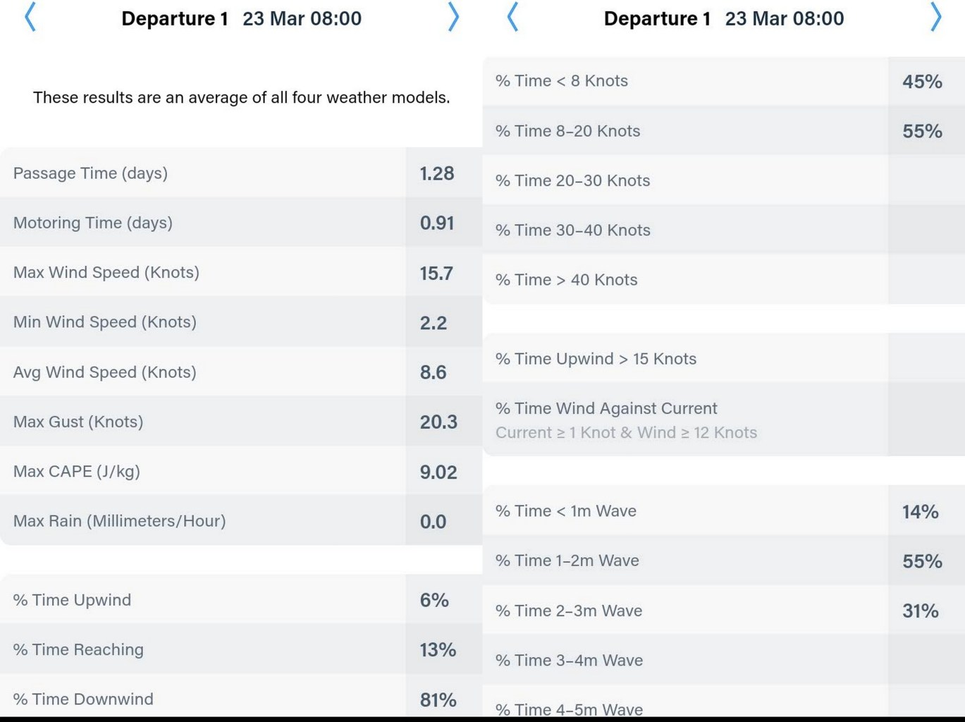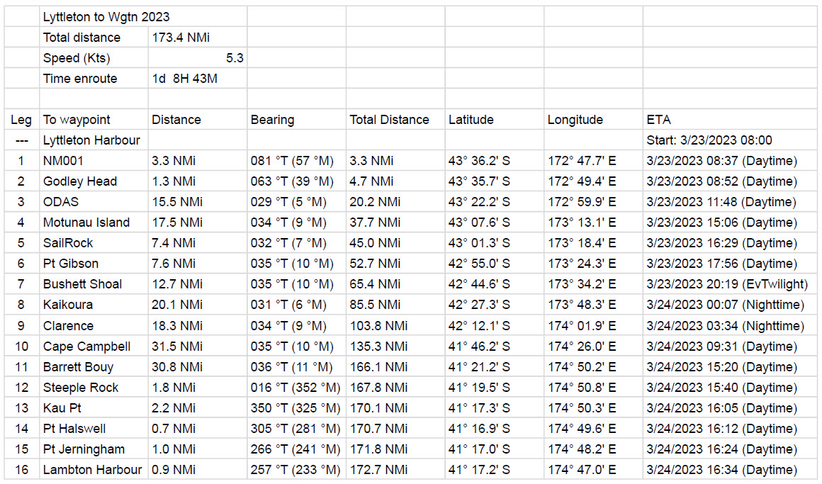The Metservice coastal forecasts for Conway and Cook were looking good for Thursday and Friday and according to the Predictwind Departure Planning app we could expect good weather with mainly tail breezes for the trip.