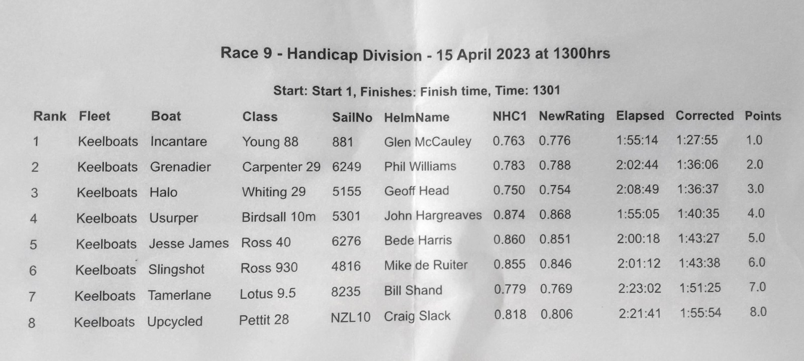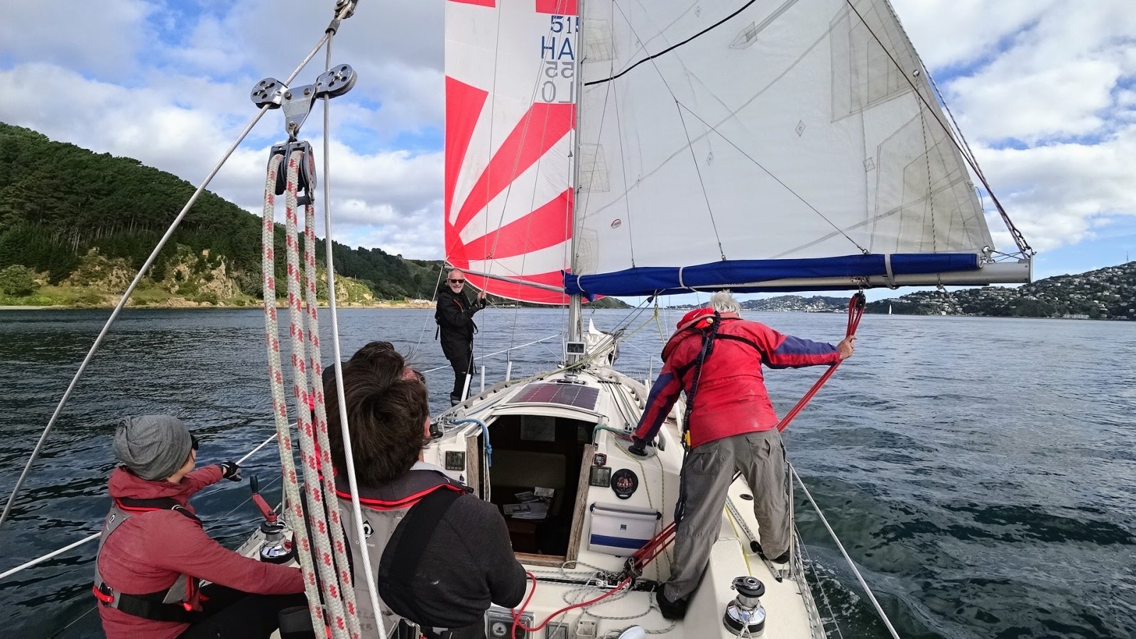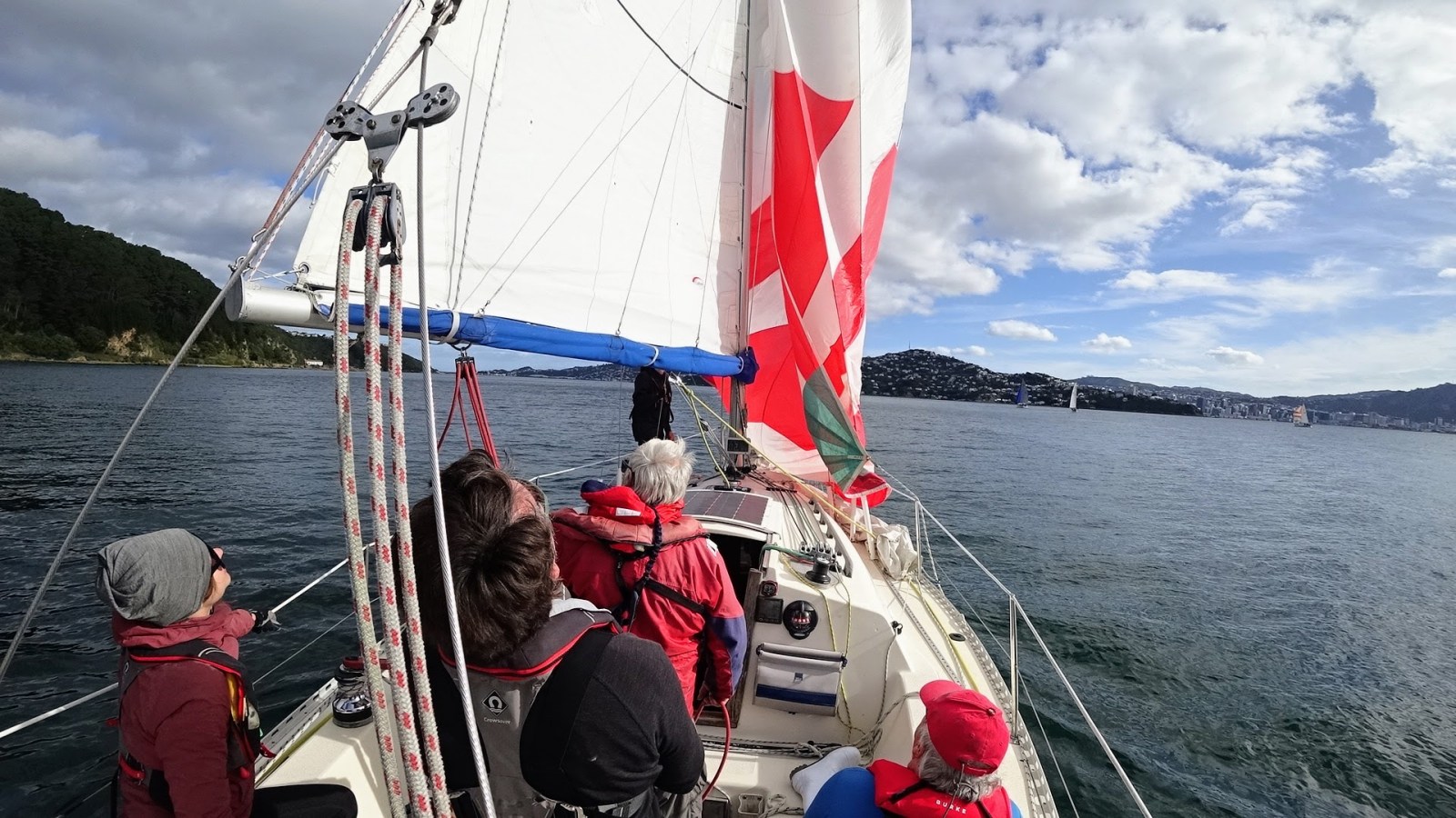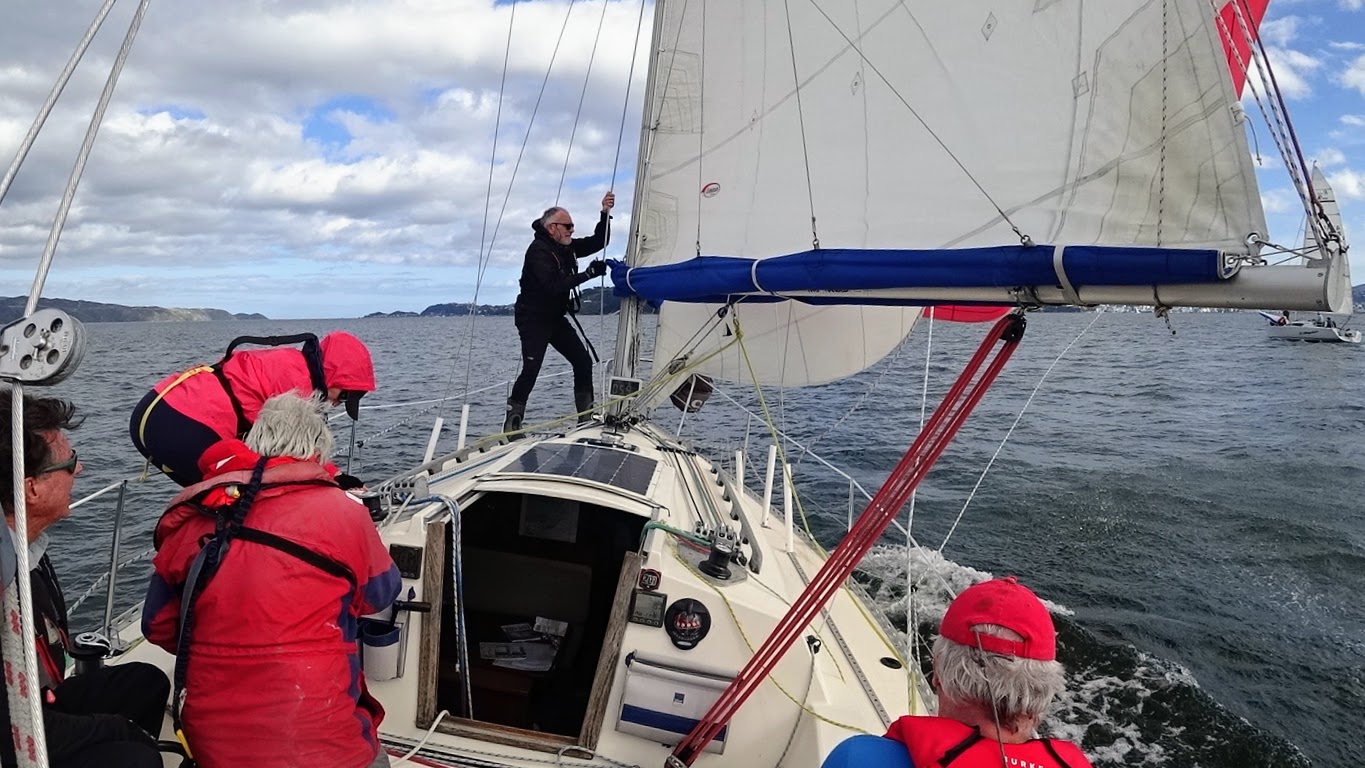 By the time we passed Shelly Bay the wind had backed to the south and we hoisted the genoa and dropped the spinnaker to sail close-hauled down the bay to cross the finish line at 1509 hrs.