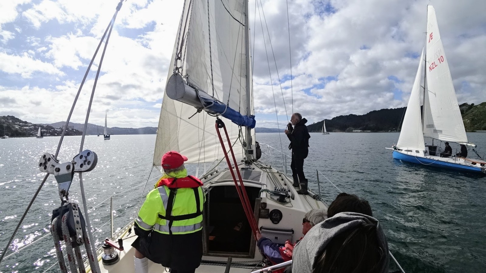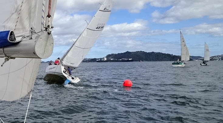 Incantare and Usurper, who sailed much closer to the shore, found a more consistent wind and streaked ahead. We maintained good speed across the harbour and up to the Ngauranga mark. After we tacked around the mark we had the Port Nick boat Saucy Sausage just in front of us so we had to tack back onto starboard to get clear air.