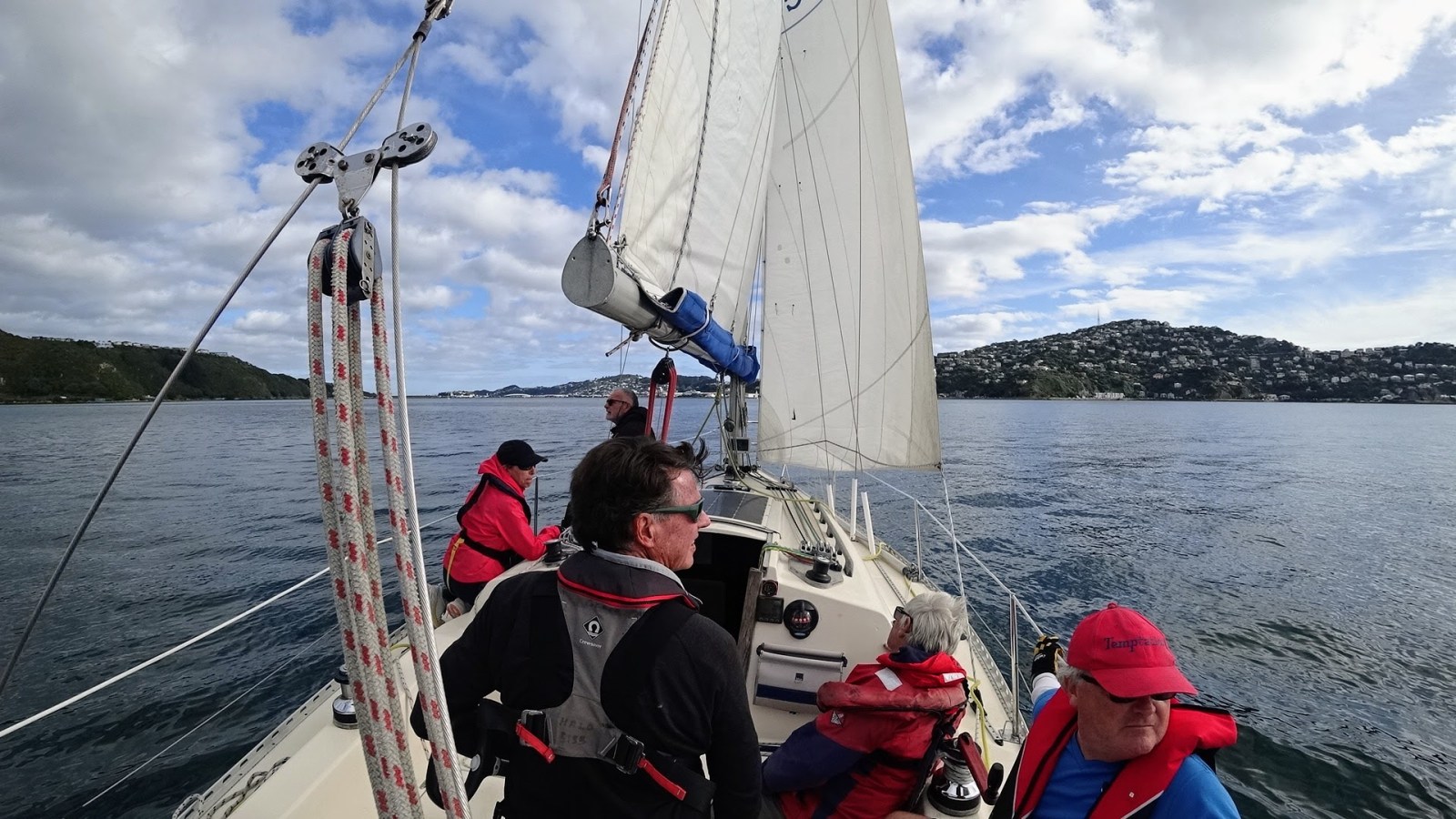 We cast off from Chaffers just after 11 am and sailed round to Pt Jerningham in a nice 10 kts north-easterly breeze. As we entered Evans Bay, however, the wind died out and even turned to a light southerly as we tied up at the wharf.
