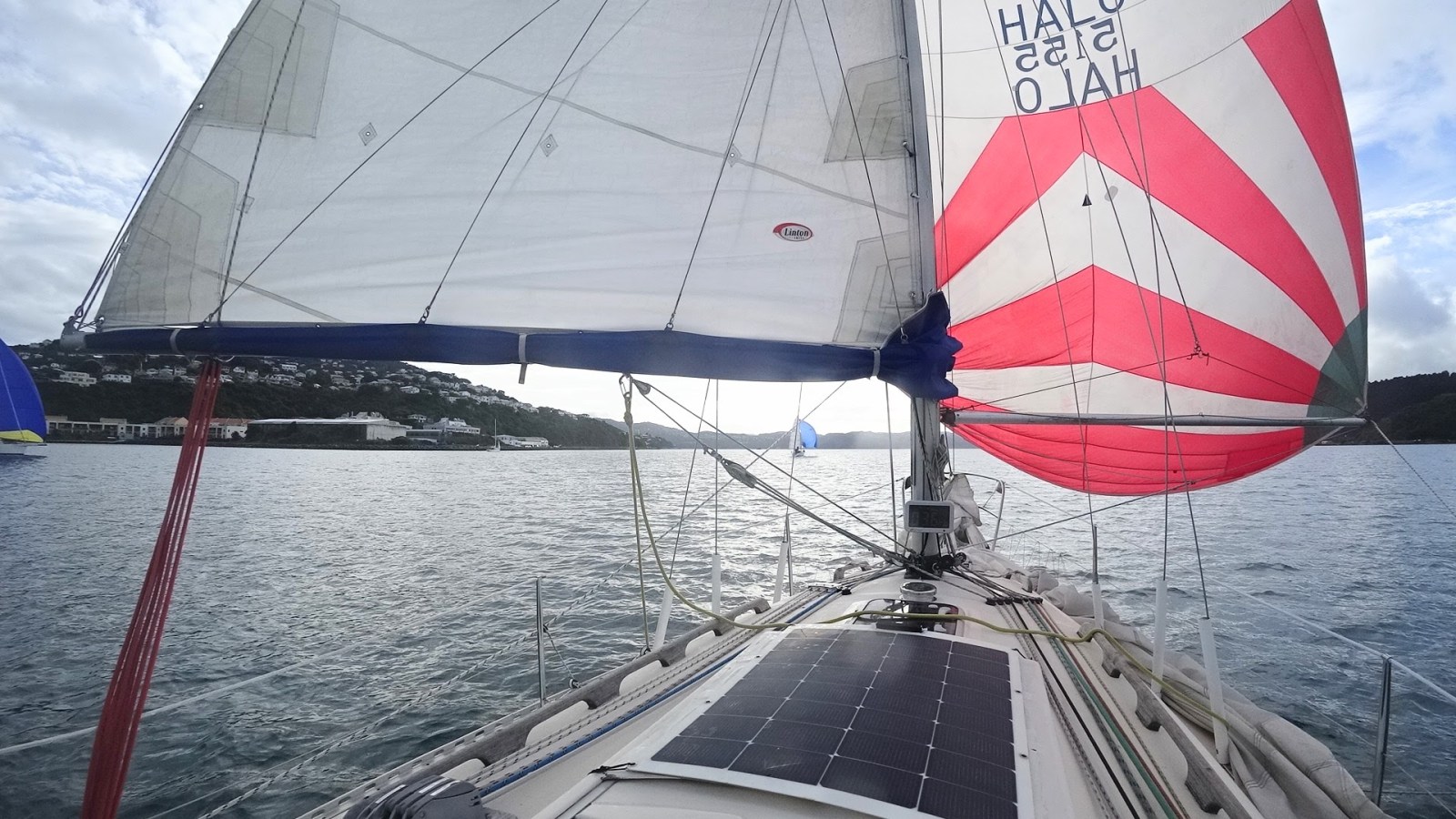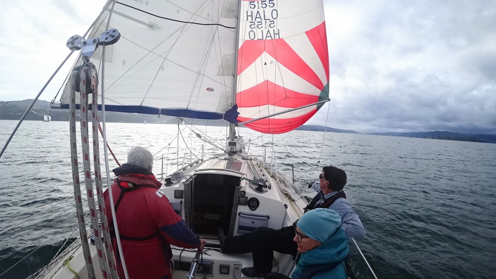 With our maxi spinnaker rigged up we cast off from the wharf at 1150 hrs with Murray on helm, Jason on mainsheet, Anastasia and Vivien on sail trim, Louise on keys and me on foredeck. The wind was very light for the start so we hovered close to the line, ready for the gun at 1215 hrs. We hoisted the kite just before the start and somehow managed to get ahead of most of the fleet of 13 boats. A great start for Halo!