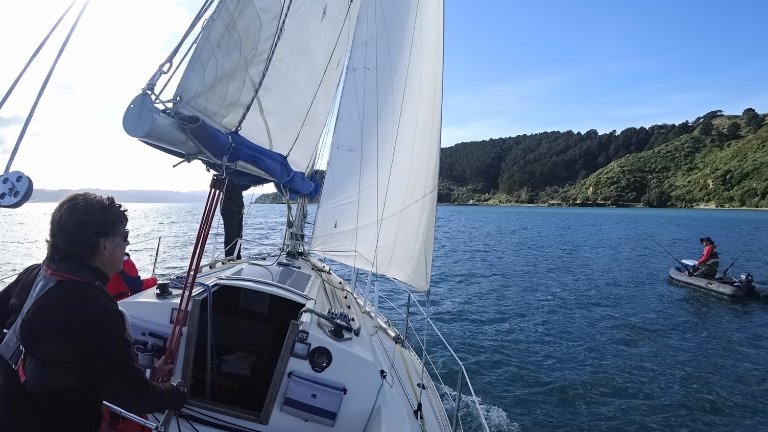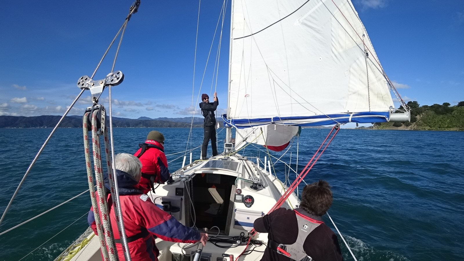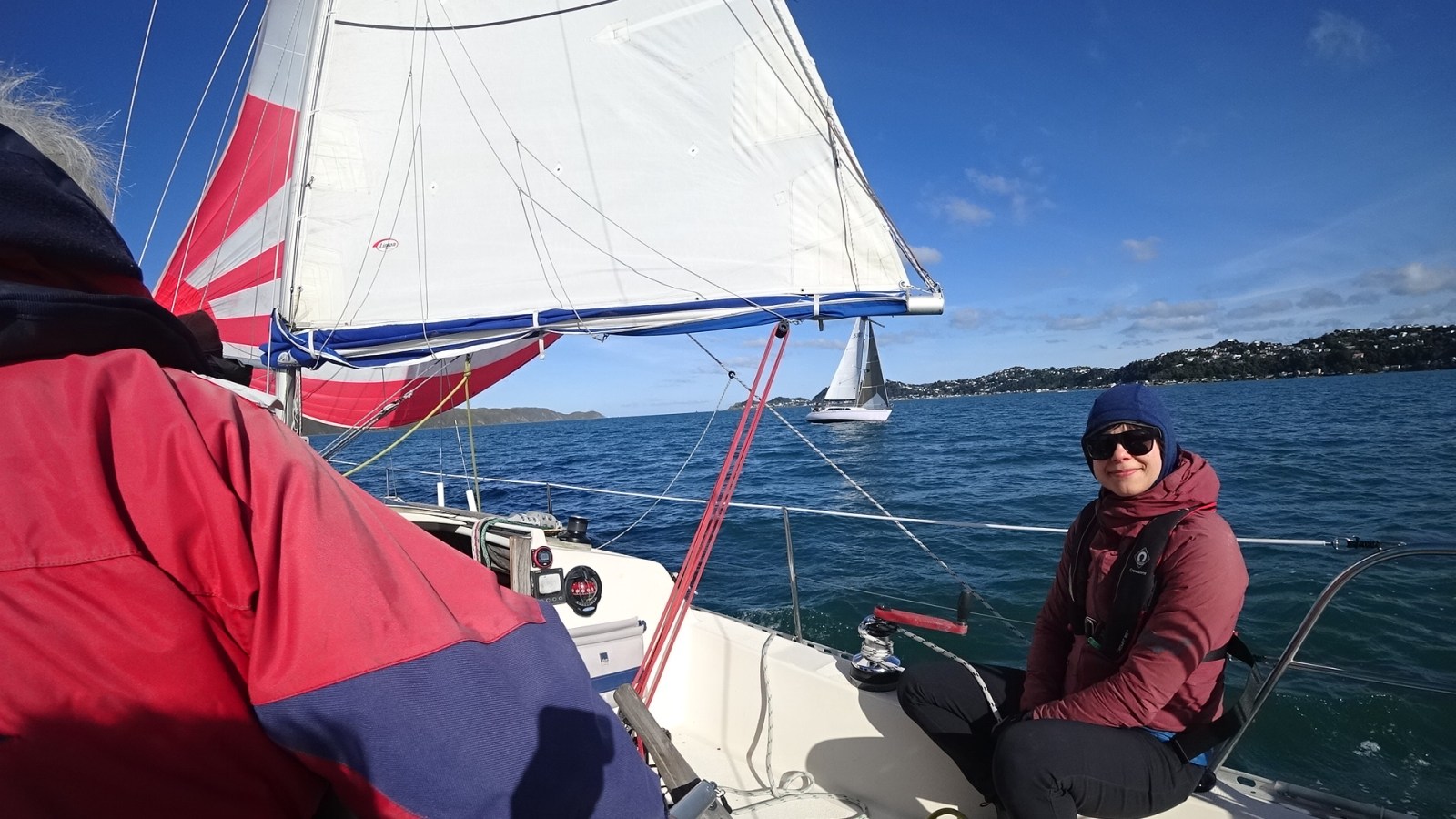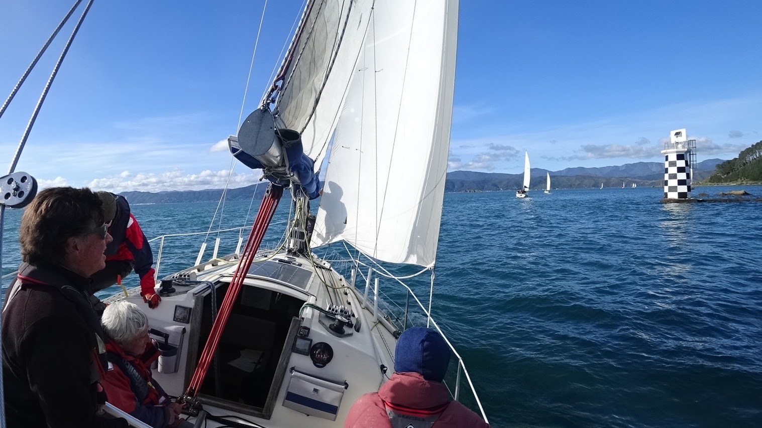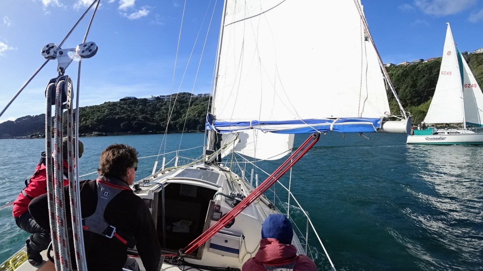 A gentle 5-6 kts NE breeze was blowing as we sailed round to Evans Bay and we took the opportunity to play around with the genoa sail trim and jib car position to get all the tell tales flowing correctly.