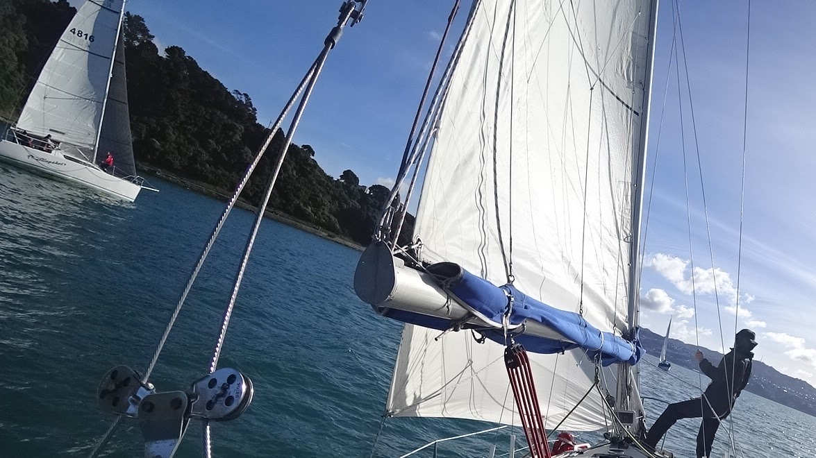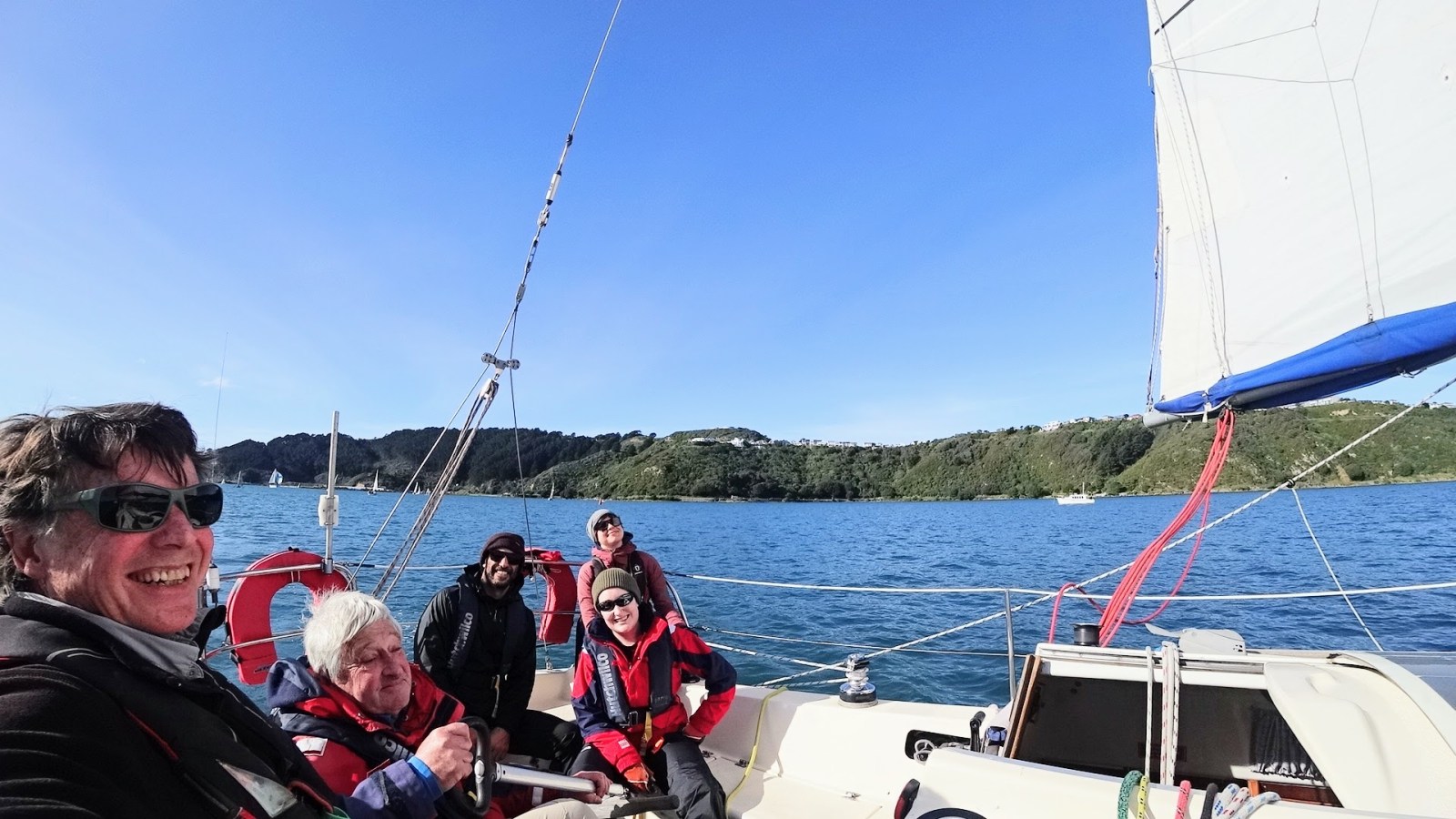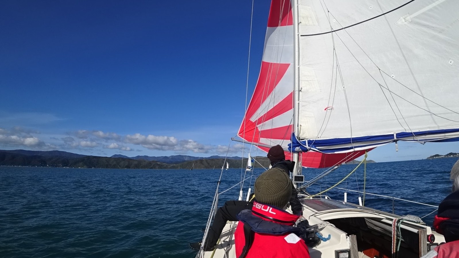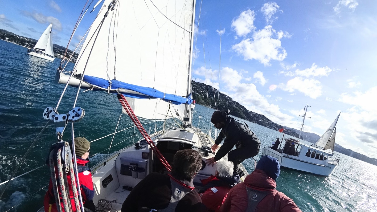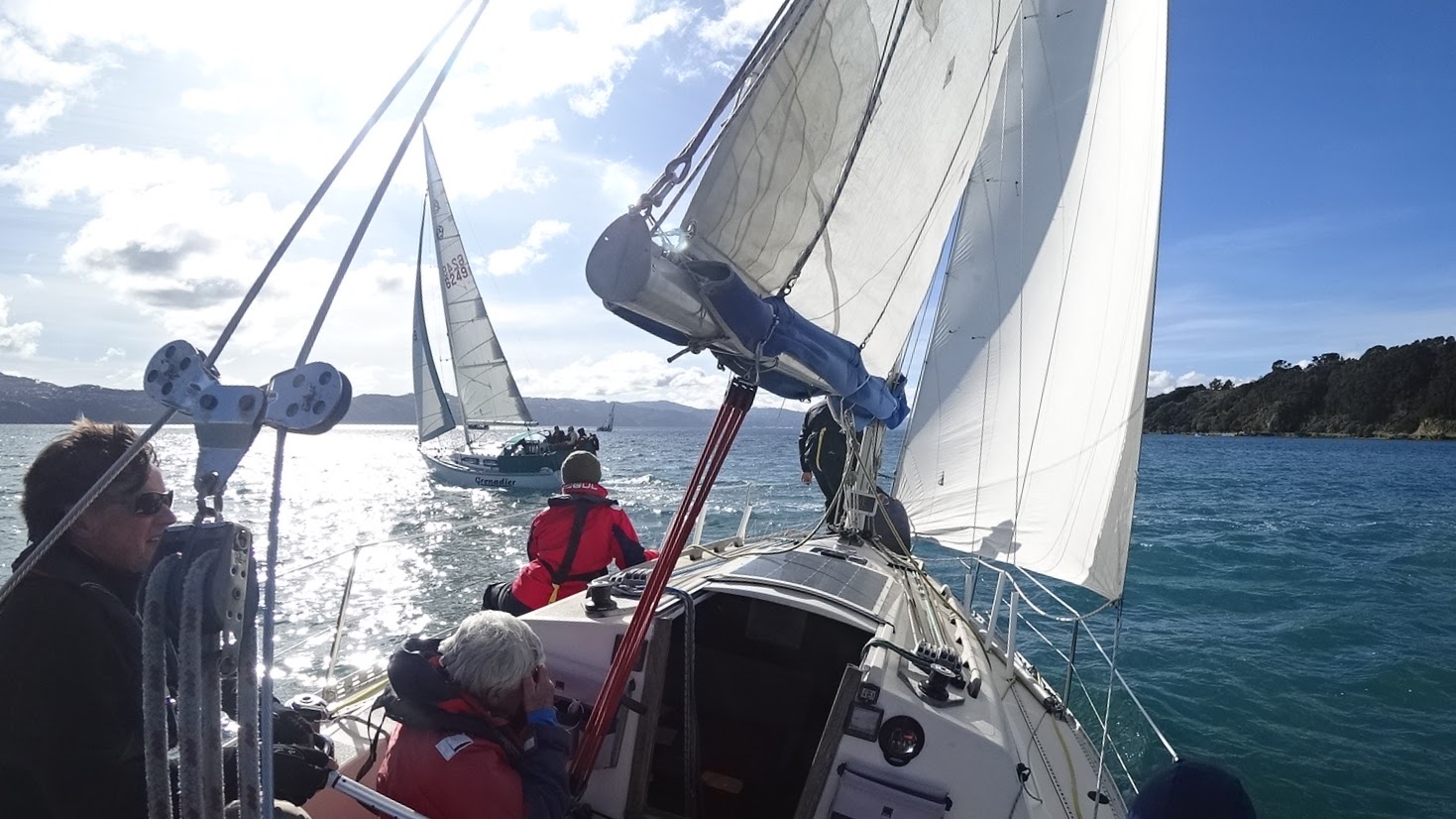 A gentle 5-6 kts NE breeze was blowing as we sailed round to Evans Bay and we took the opportunity to play around with the genoa sail trim and jib car position to get all the tell tales flowing correctly.