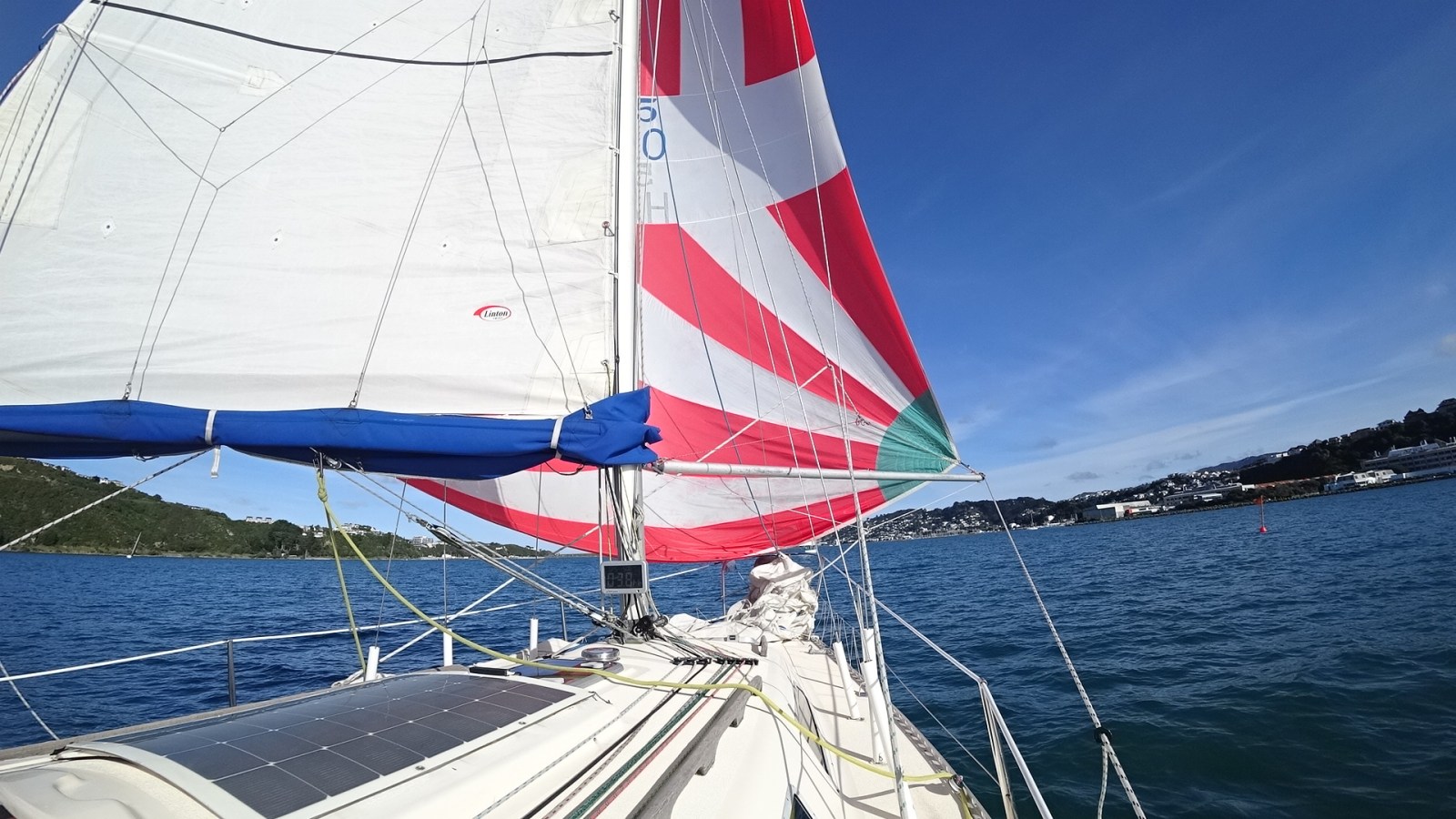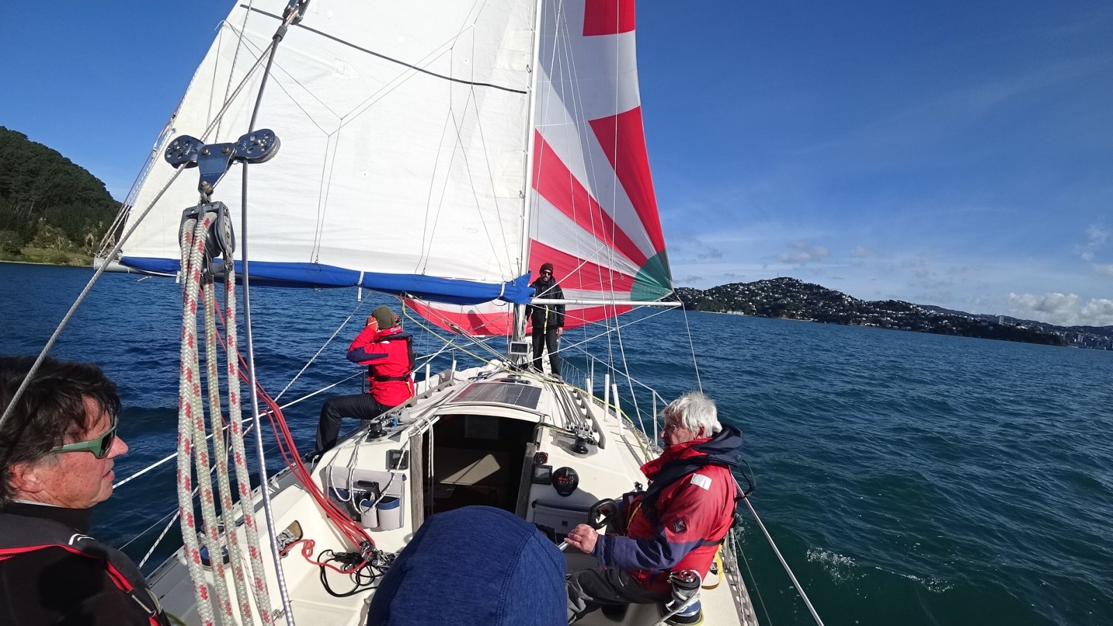 In the meantime Yareen and I re-rigged the spinnaker, this time with the pole out to starboard. Soon after we rounded Pt Halswell we had the kite hoisted and flying beautifully on a run down Evans Bay in around 8 kts of northerly breeze.