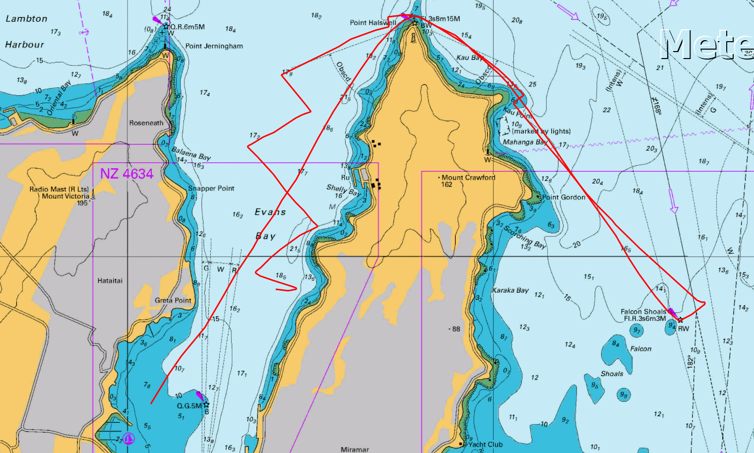 We hoisted the genoa and doused the spinnaker just before rounding Falcon Shoals light at 1300 hrs and we started the beat back towards Halswell. As we neared Kau Point we were discussing whether or not we could make it round the point when we noticed a very large clump of kelp sitting off the point. A quick tack ensured we bypassed it.