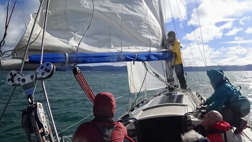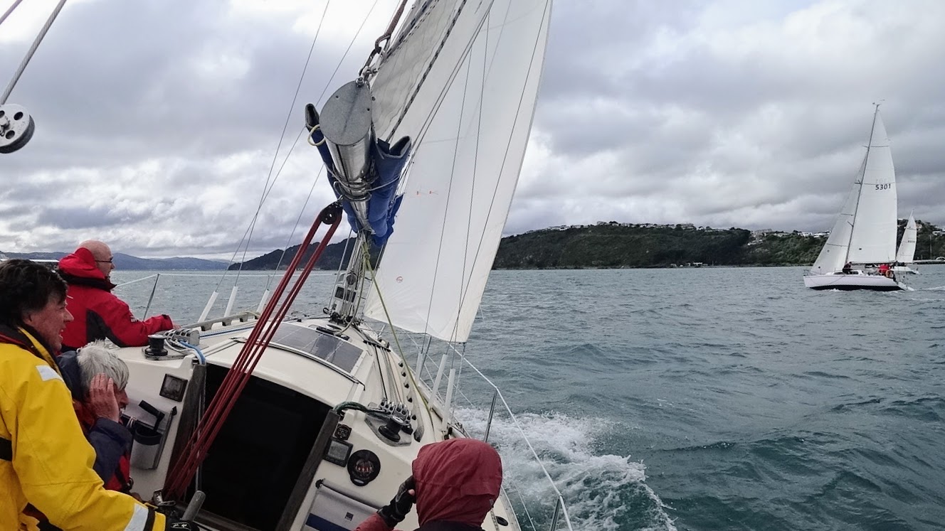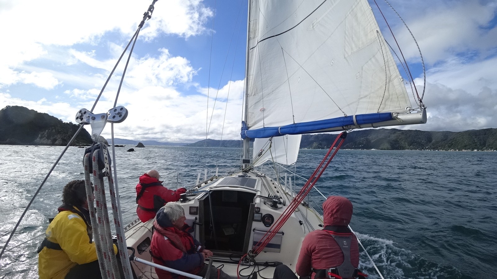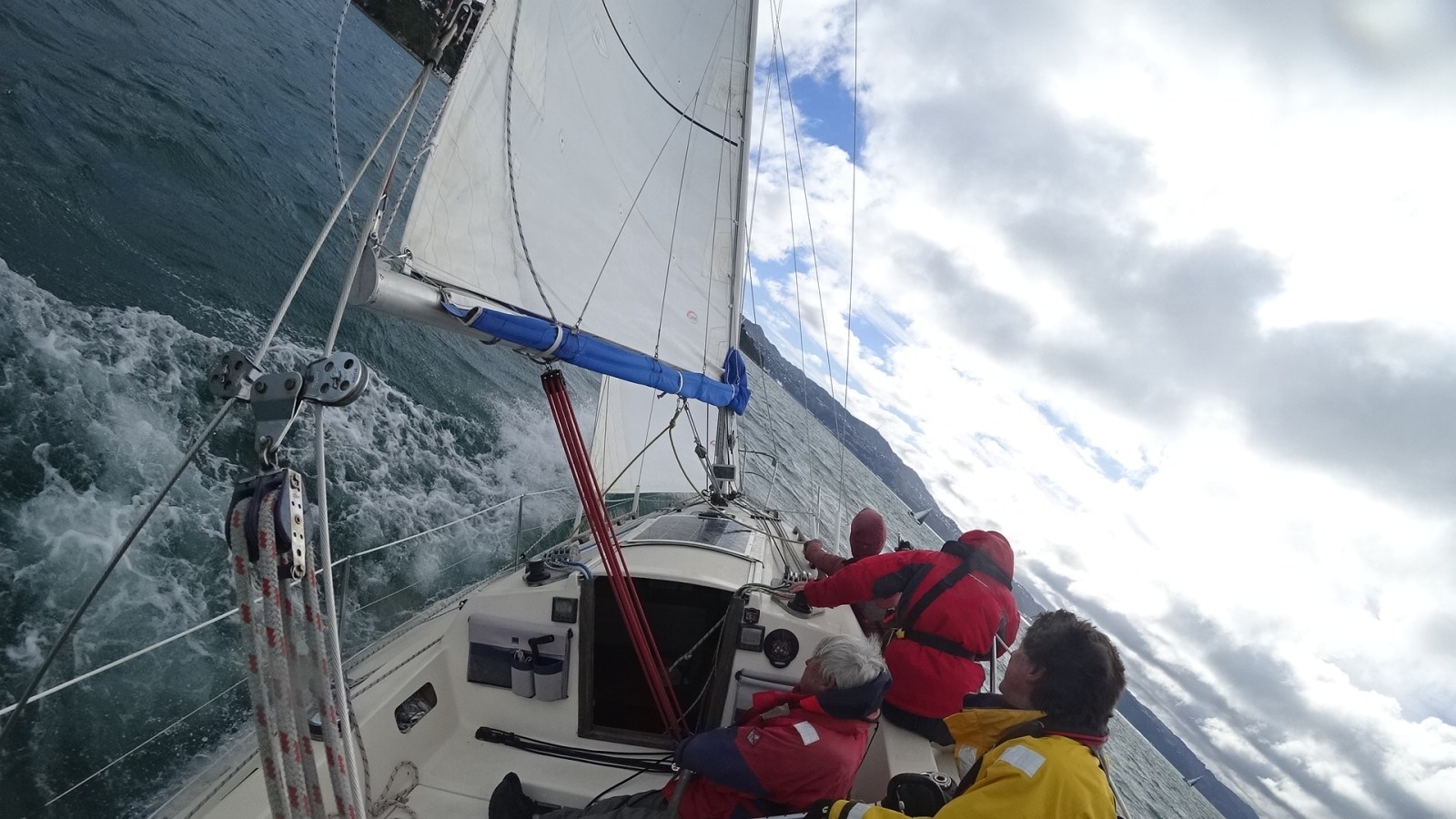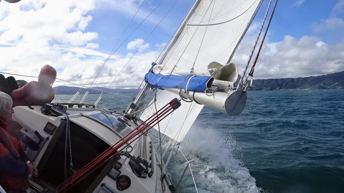 At the entrance to Evans Bay we hoisted a second headsail, the No. 1 Genoa, poled out on the starboard side. We found it quite hard to hoist with the wind in the sail and in retrospect we would have been better off poling out the jib and hoisting the genoa on the leeward side.