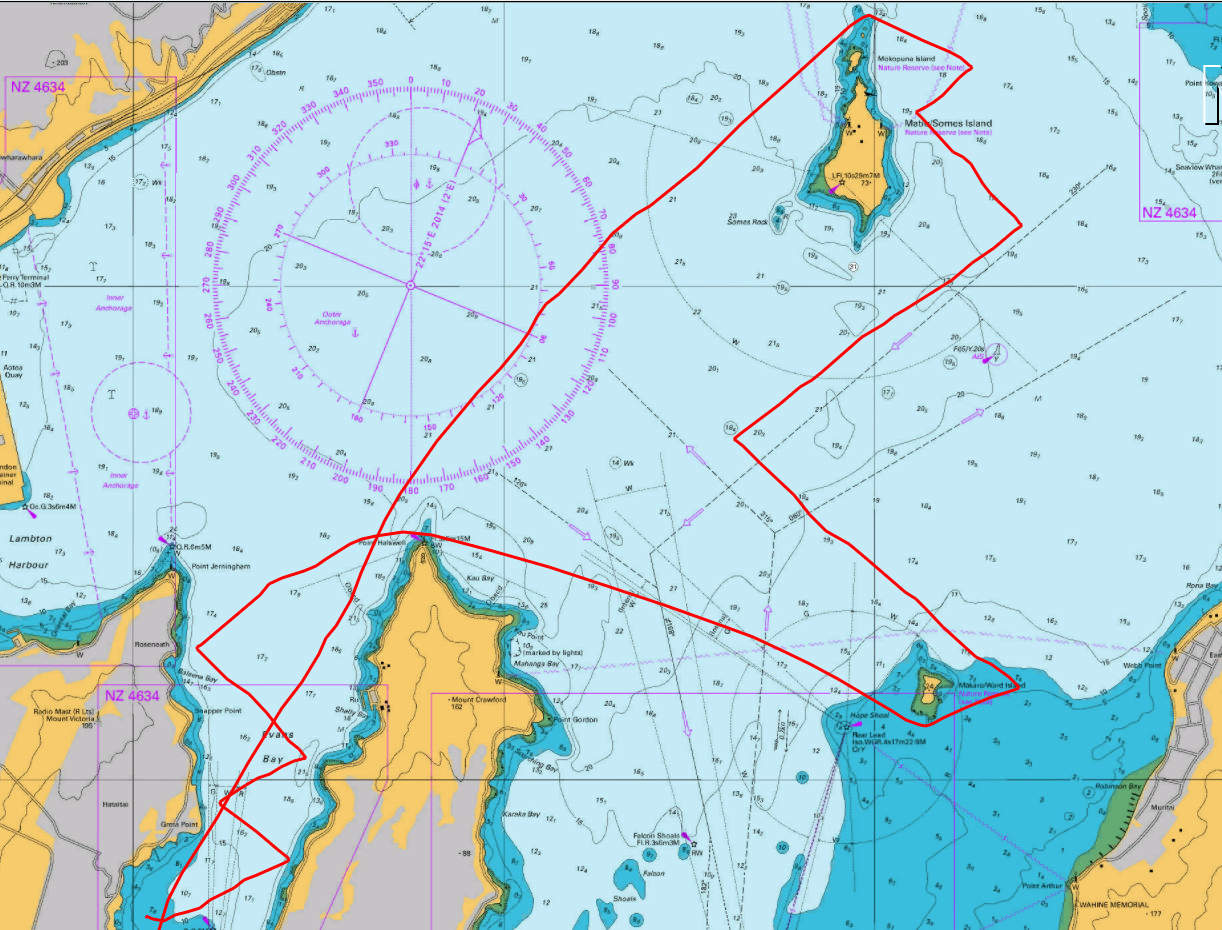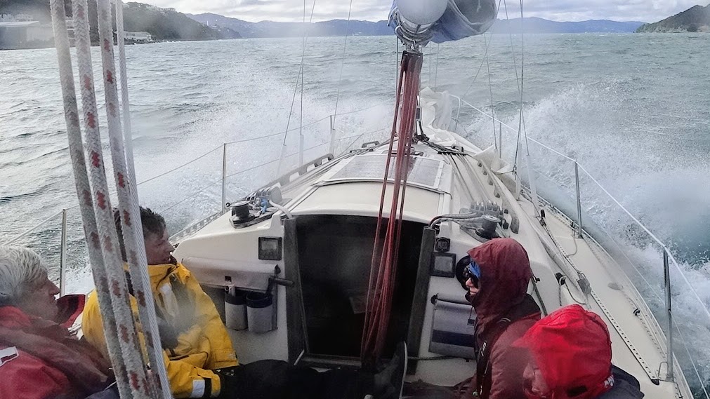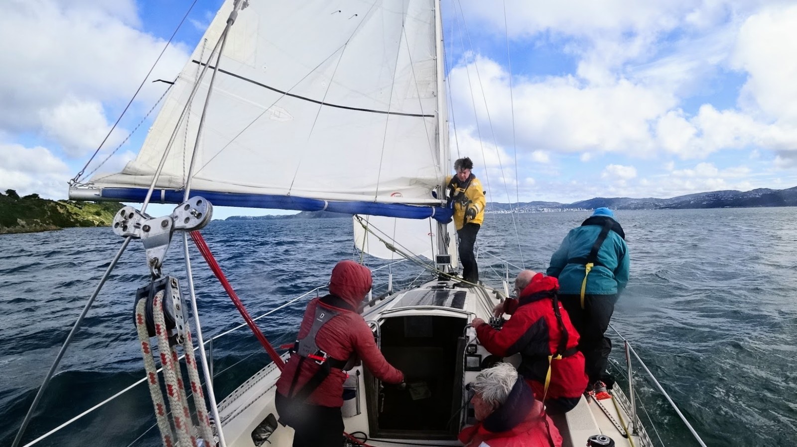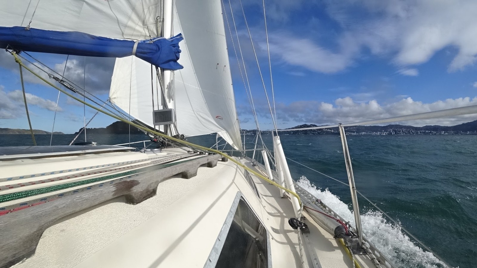 Vivien and Anastasia met me on Halo at Chaffers and after rigging the sheets we cast off from our berth at 1038 hrs. The northerly was around 15 kts with some gusts up to 20 kts at times as we rounded Pt Jerningham and sailed down Evans Bay with Vivien on helm and just the mainsail hoisted.