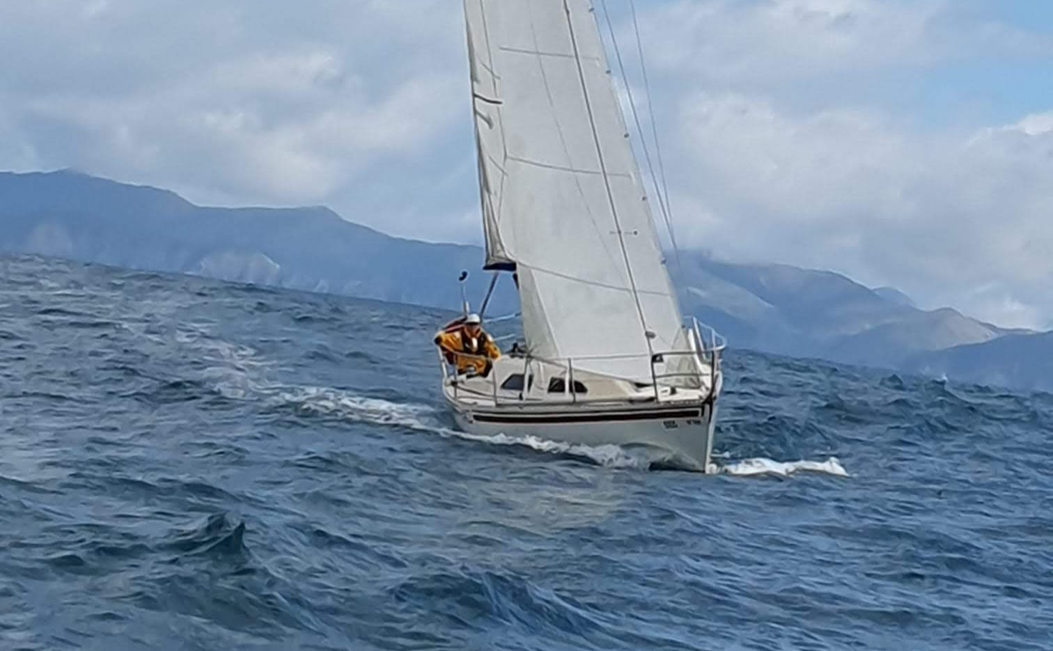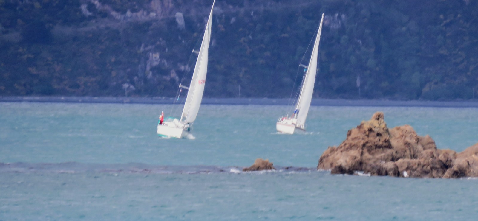 We eventually rounded Barrett Reef Buoy at 1330 hrs keeping clear of the Aratere which was making her return trip back to Wellington. The northerly increased to around 10 kts as we entered the harbour and we tacked our way from Steeple Rock. As we rounded Point Halswell Murray was there to take a couple of nice shots of the ‘return of the terrible twins‘ as he called us.