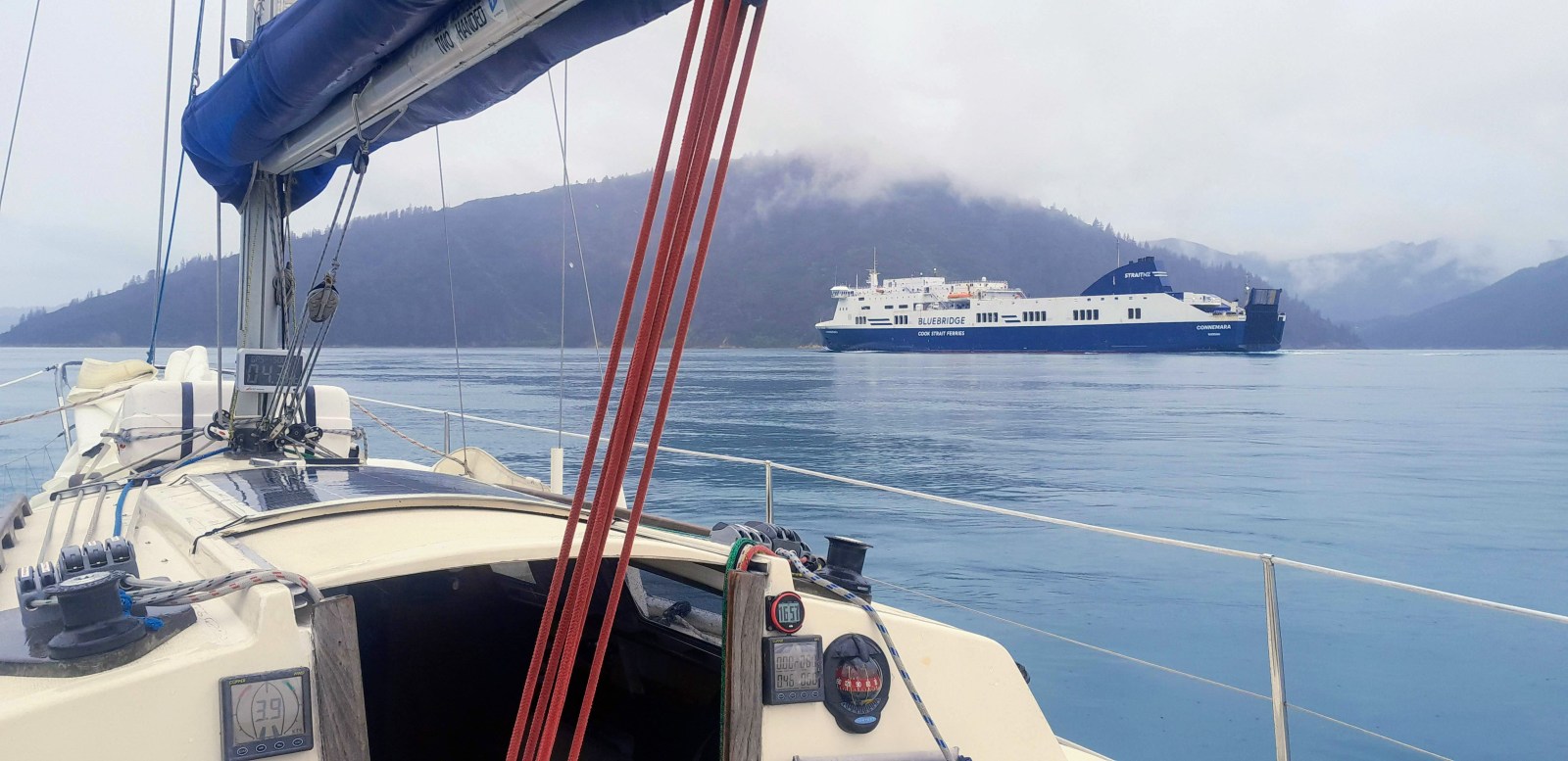 I weighed Halo’s anchor at 0745 hrs and motored up Tory Channel in company with L’Attitude Adjustment, Wakakoa, Skyhawk and Grenadier who were all doing the crossing. We crossed paths with the Strait Feronia and then the Aratere doing their early morning arrivals. I called Maritime Radio on ch. 16 who asked me to to up to ch. 71 to report my trip report (TR).