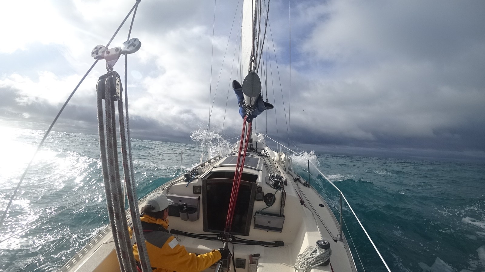 When we reached the Karori Rock waypoint at 1200 hrs the southerly swells were getting big and we saw massive waves breaking in the rip towards Sinclair Head. We decided to sail even further south to keep well away from them. The swells were indeed massive as we climbed up walls of water at times. We ended up about 4 miles south of Sinclair Head before starting our turn in towards the Heads.