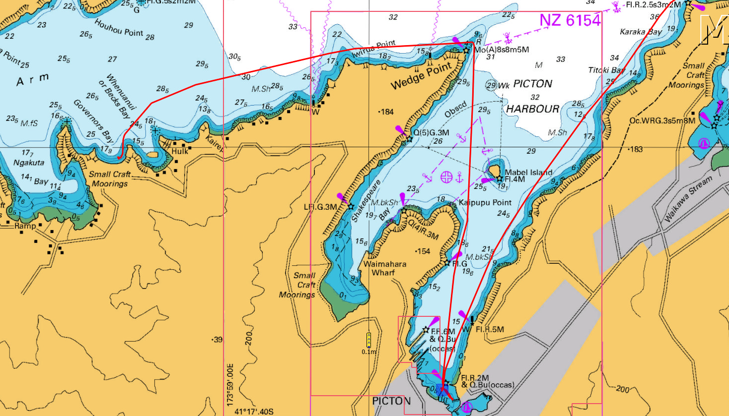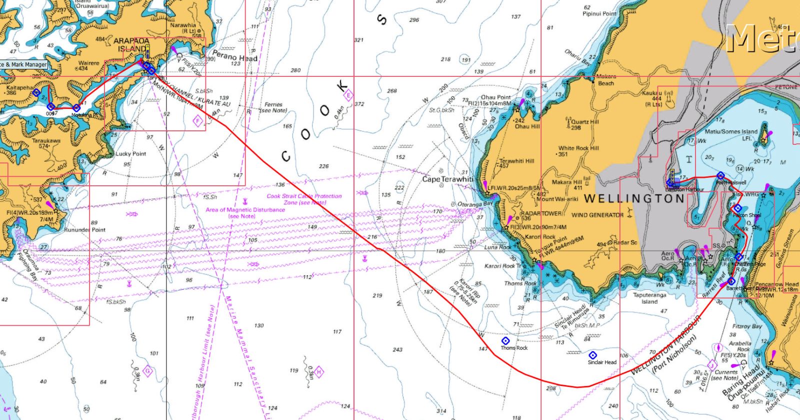 The big day has arrived! The forecast for Cook Strait is variable 10 kts with southerly swell 3 mts. The Port Marlborough website was showing maximum wave height of 4.86 mts and significant height of 2.89 mts. Gulp. The tide tables predict that the Tory Channel tide will start setting East at 0915 hrs.