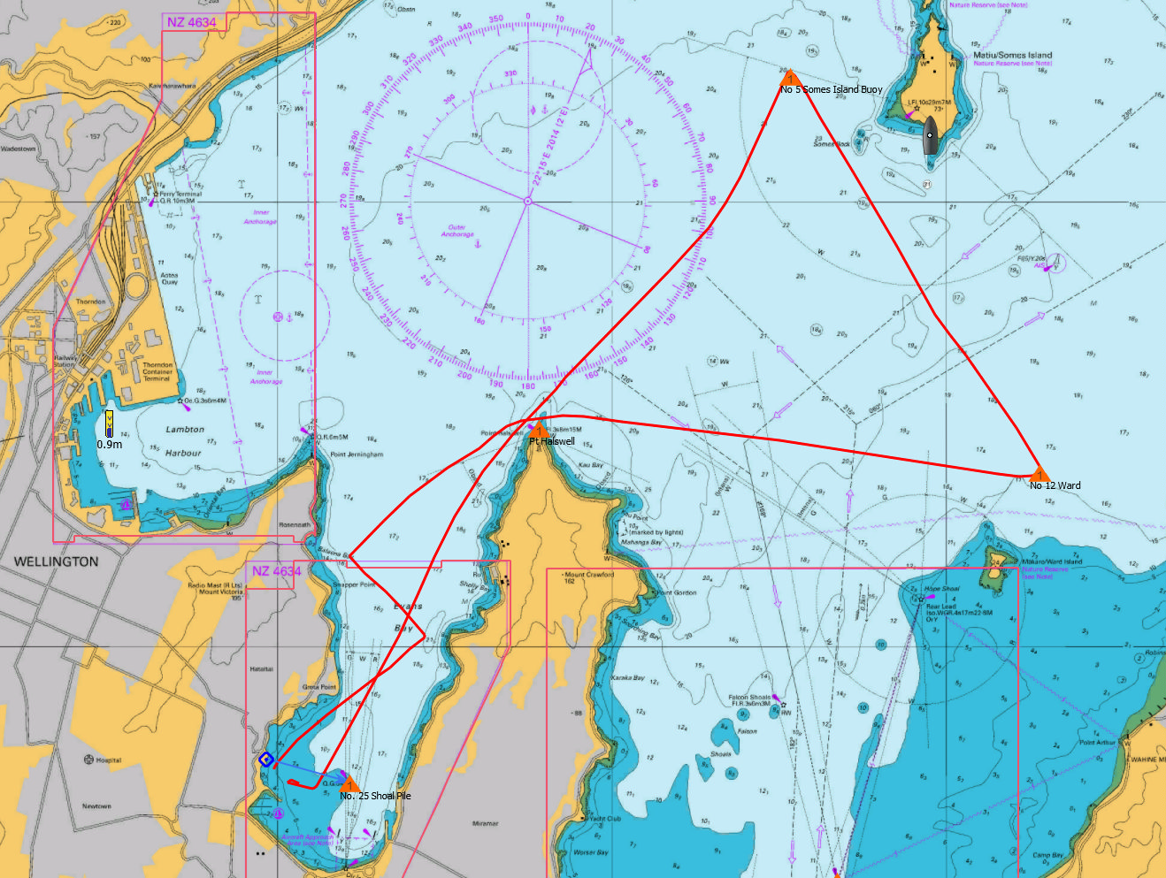 Murray and I cast off from Chaffers Marina at 1115 hrs and motored round to Evans Bay with around 15 kts southerly. We rigged up the small no. 3 jib considering the Metservice forecast and being short-handed. We arrived at EB wharf 1153 hrs. The course was announced: Start – #5 Somes west – #12 Ward north – Finish.