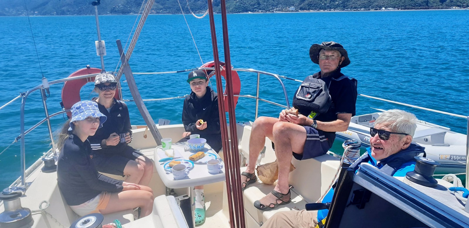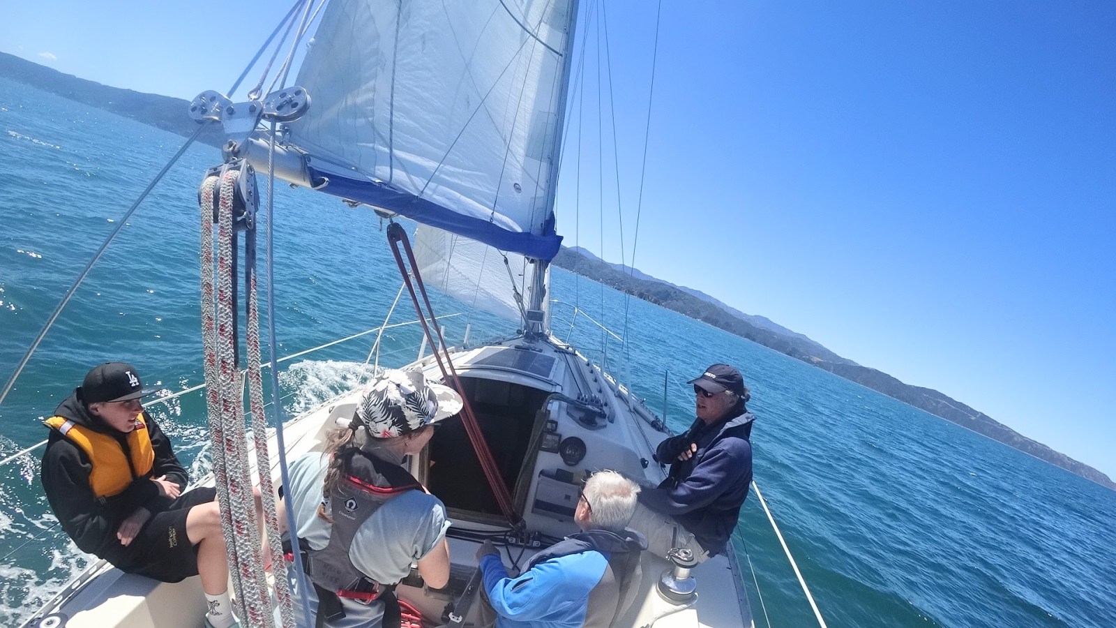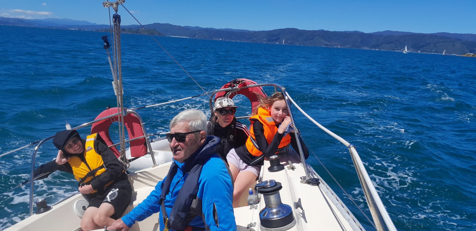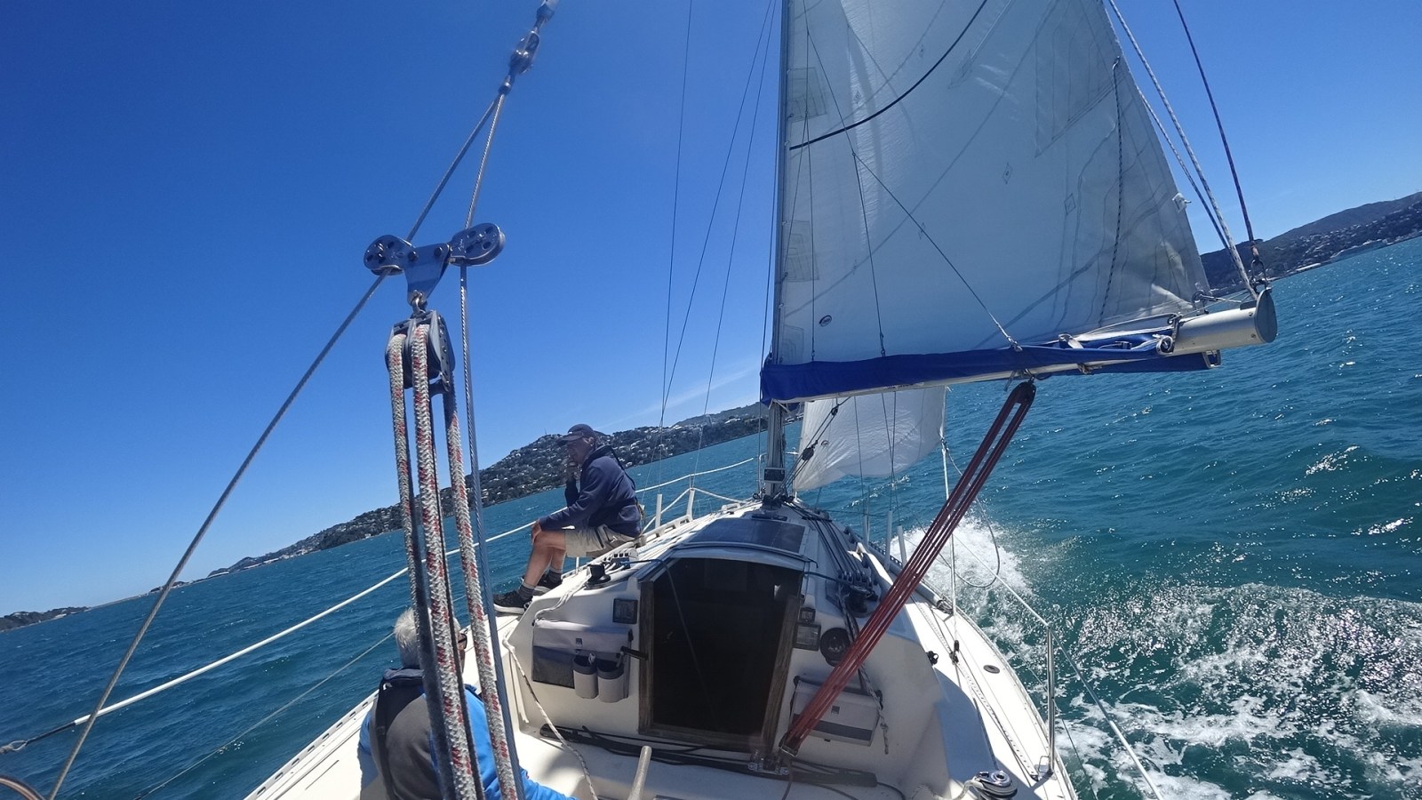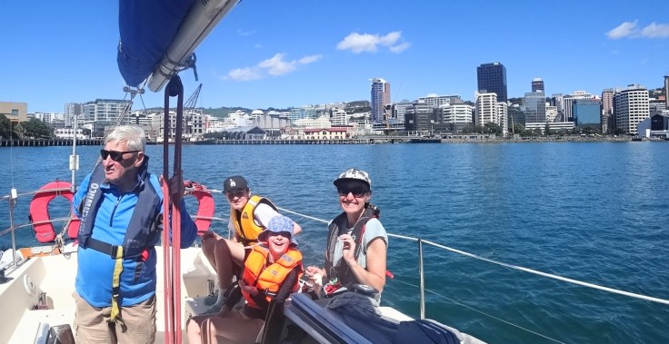 Once we were out of the shelter of Ward Island the southerly was 12-15 kts and we had a fun sail back home at 6 kts with Murray on helm, me on sail trim, and Louise, Lucas and Chelsea holding on tight 🙂