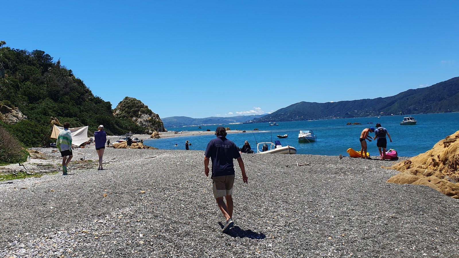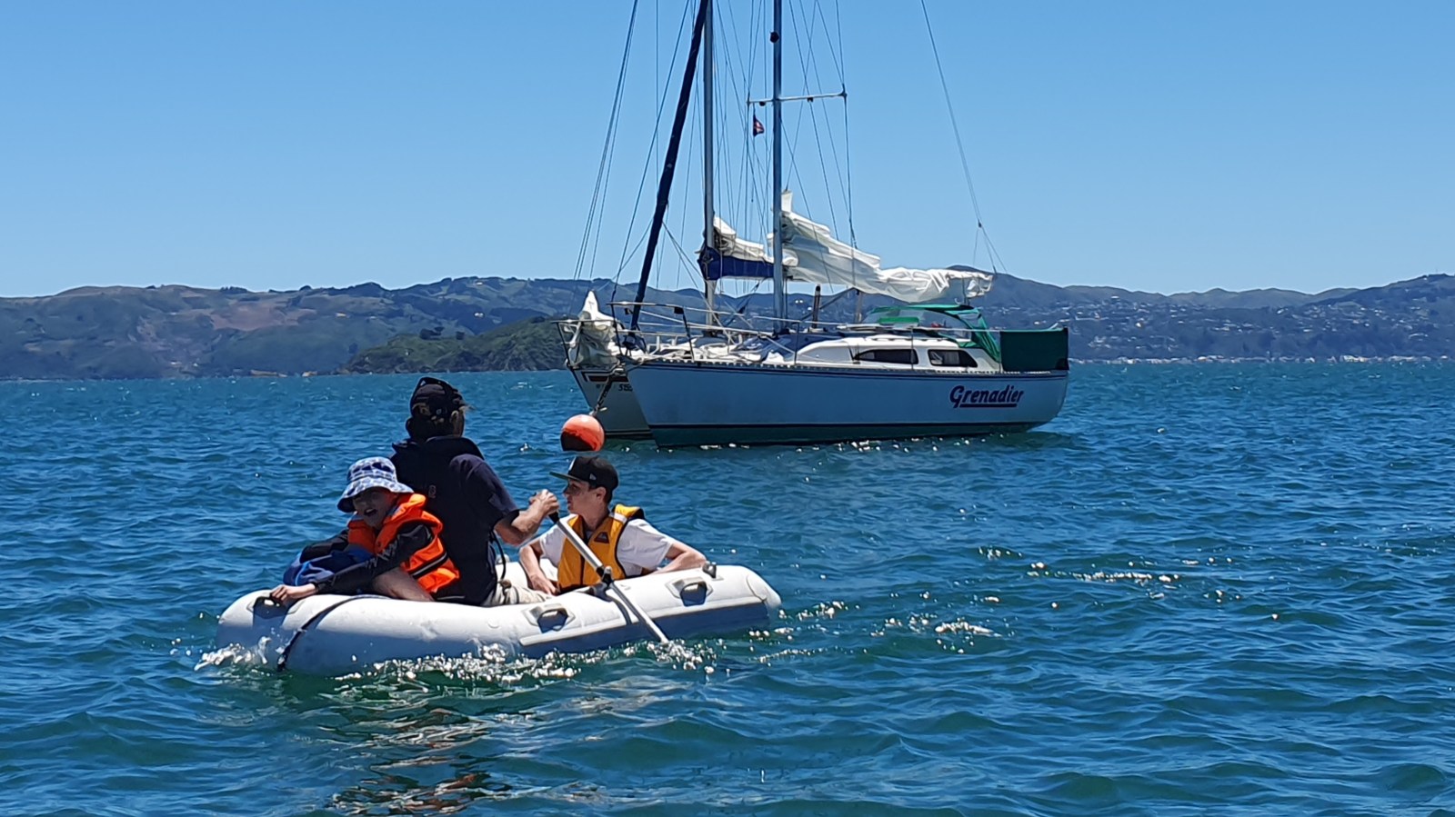 A stunning Wellington day for sailing so I invited niece Louise and family to join me for a trip to Ward Island. I coordinated with Phil on Grenadier for a raft-up at the club mooring. Murray joined the crew and after donning life jackets and extra layers of sunscreen we cast off from Chaffers at 1053 hrs. We hoisted the no. 2 jib with full main and started motor sailing out of Lambton Harbour towing the dinghy behind us.