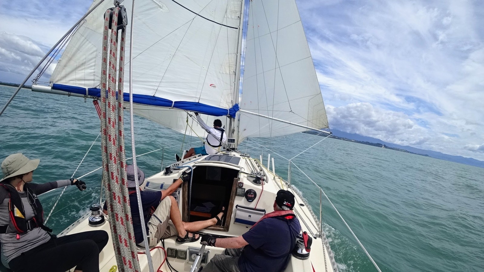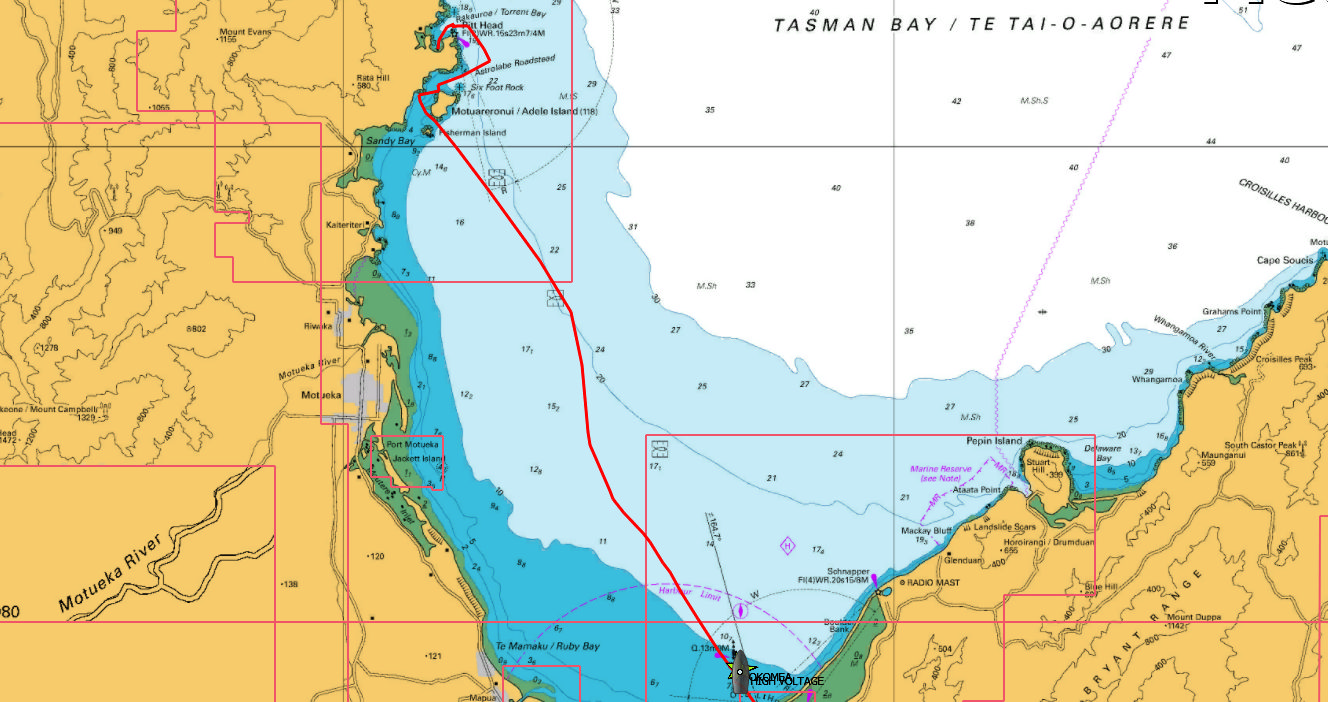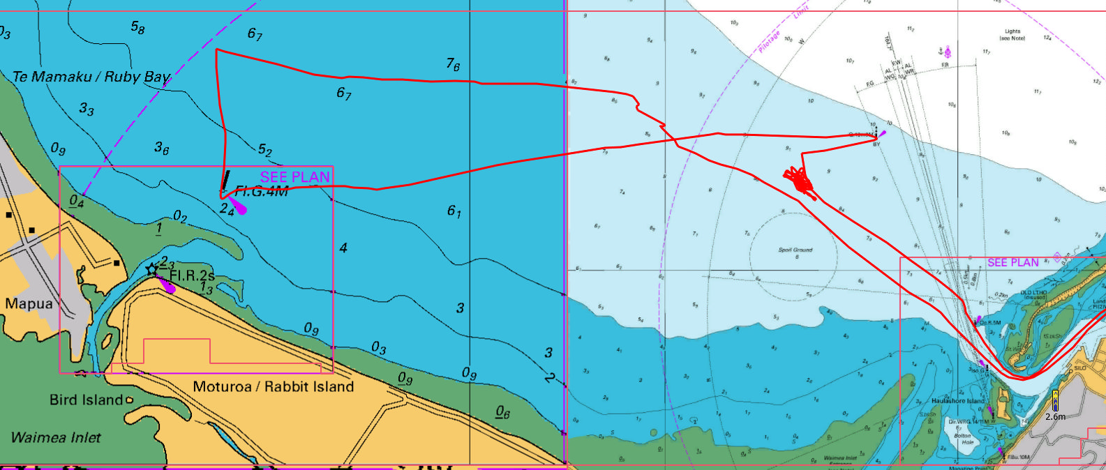 We hoisted our no. 2 jib with full main and with Murray on helm we followed the other boats up to the north cardinal mark. We then turned left and headed towards Mapua. We eventually figured out the mark was the Starboard Channel Pile at the entrance to Mapua