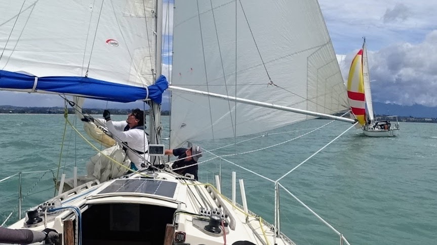 With knowledge I had learned from Richard last night, we hoisted our medium spinnaker for the broad reach across the bay. This time it was Zara Maria a Lotus 9.2 we were duelling with. Our reaching kite went really well and we held our own all the way across to Mapua.