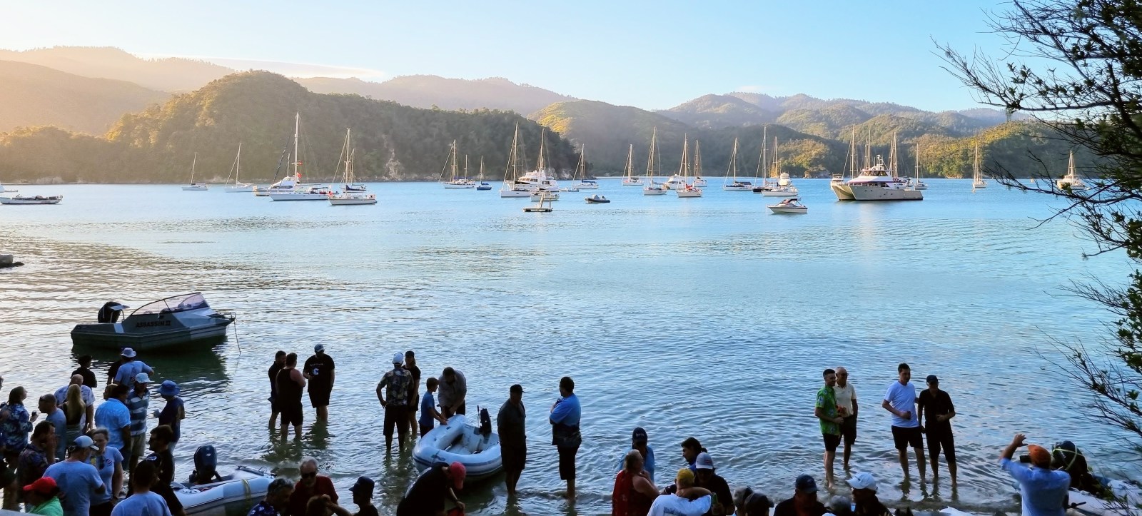 I went for a row in the dinghy around the anchorage visiting some of the other boats. The crew of another Wellington boat, 88% Proof, welcomed me aboard for a gin and tonic. They also suggested we move over closer to them. Plenty of space for Halo they said, so we weighed anchor and relocated over the bay closer to where the BBQ would be held on the beach.