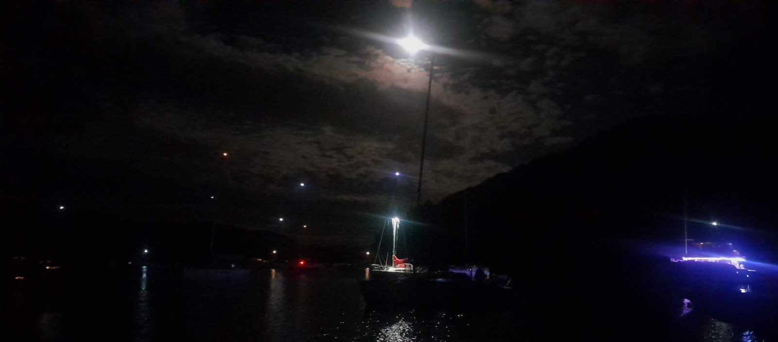 We were all sleeping soundly when at about 4 am a wind squall arrived and suddenly the anchor alarm was sounding! It was pouring with rain and we were dragging anchor towards the rocks!