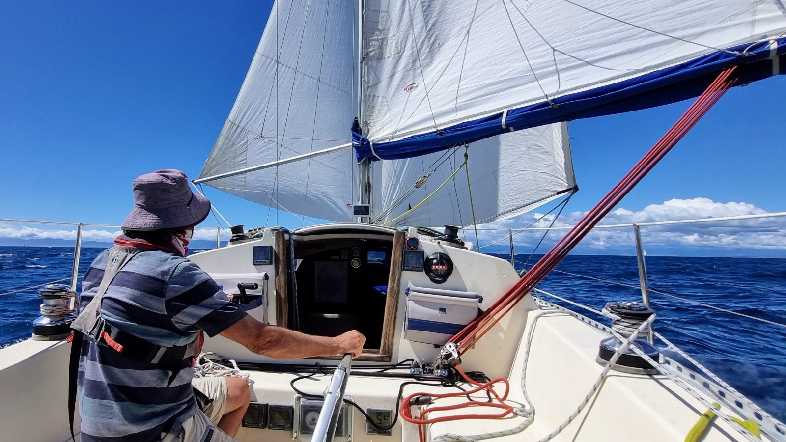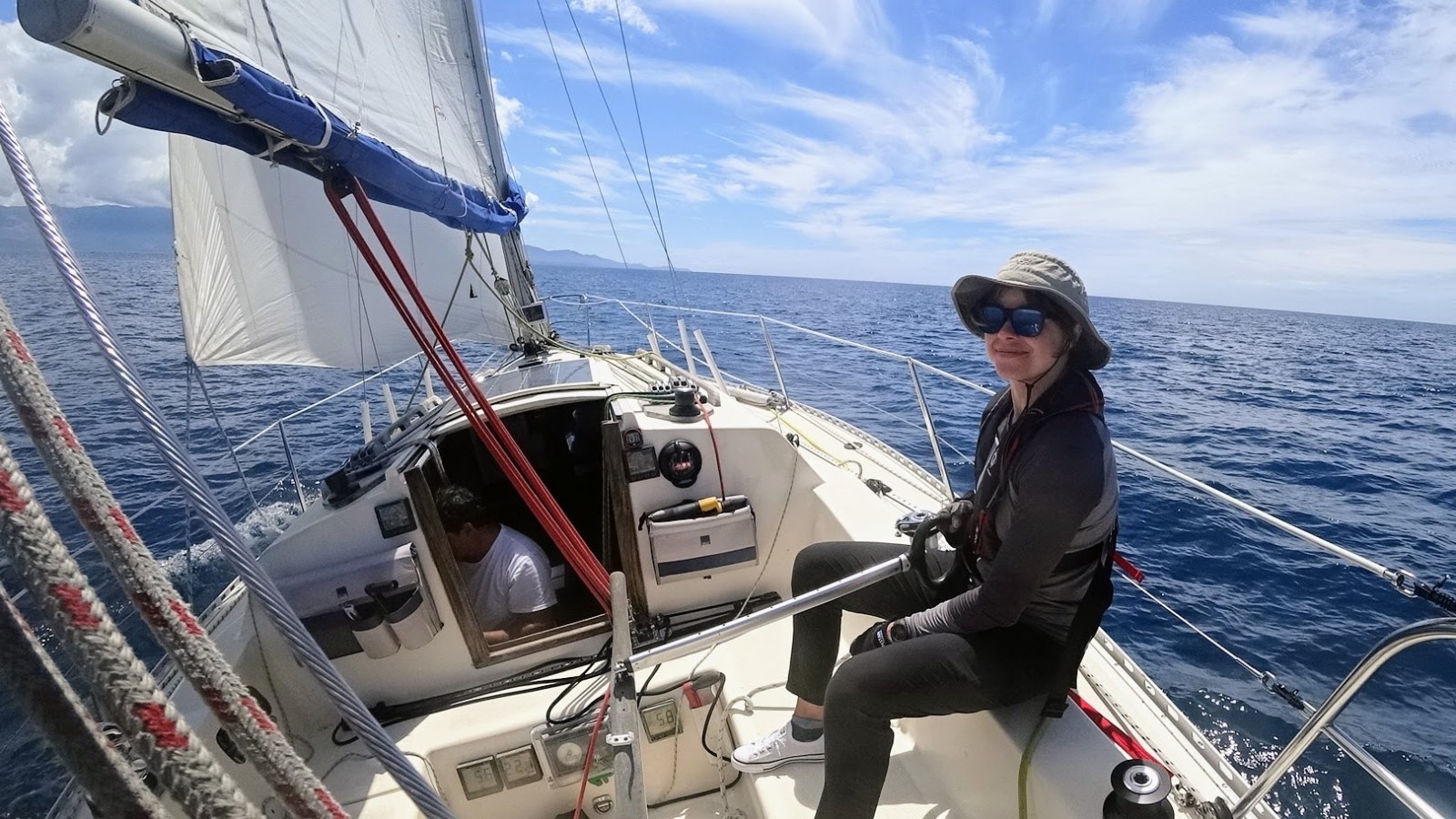 At about 1200 hrs the sky cleared with the wind dropping down to under 5 kts and backing to the east. We gybed the main and spinnaker. We cruised slowly along and handed over the helm to the autotiller “Ernesto’ (our fourth crew member) and Tunch put out the fishing line. Very relaxing!