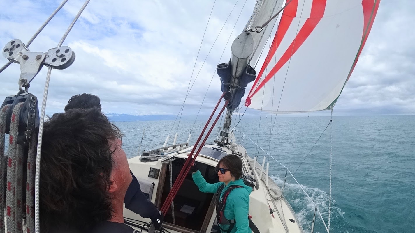 The light southerly breeze was coming from behind us so we were on a broad reach. Some of the other boats were sailing with gennakers. We decided to pole out the jib and hoist a second headsail, the no. 1 genoa, which worked very well for us. We were doing around 6.5 kts and caught up with Kakariki, a Davidson 31, before we reached the mark at the entrance to Mapua.