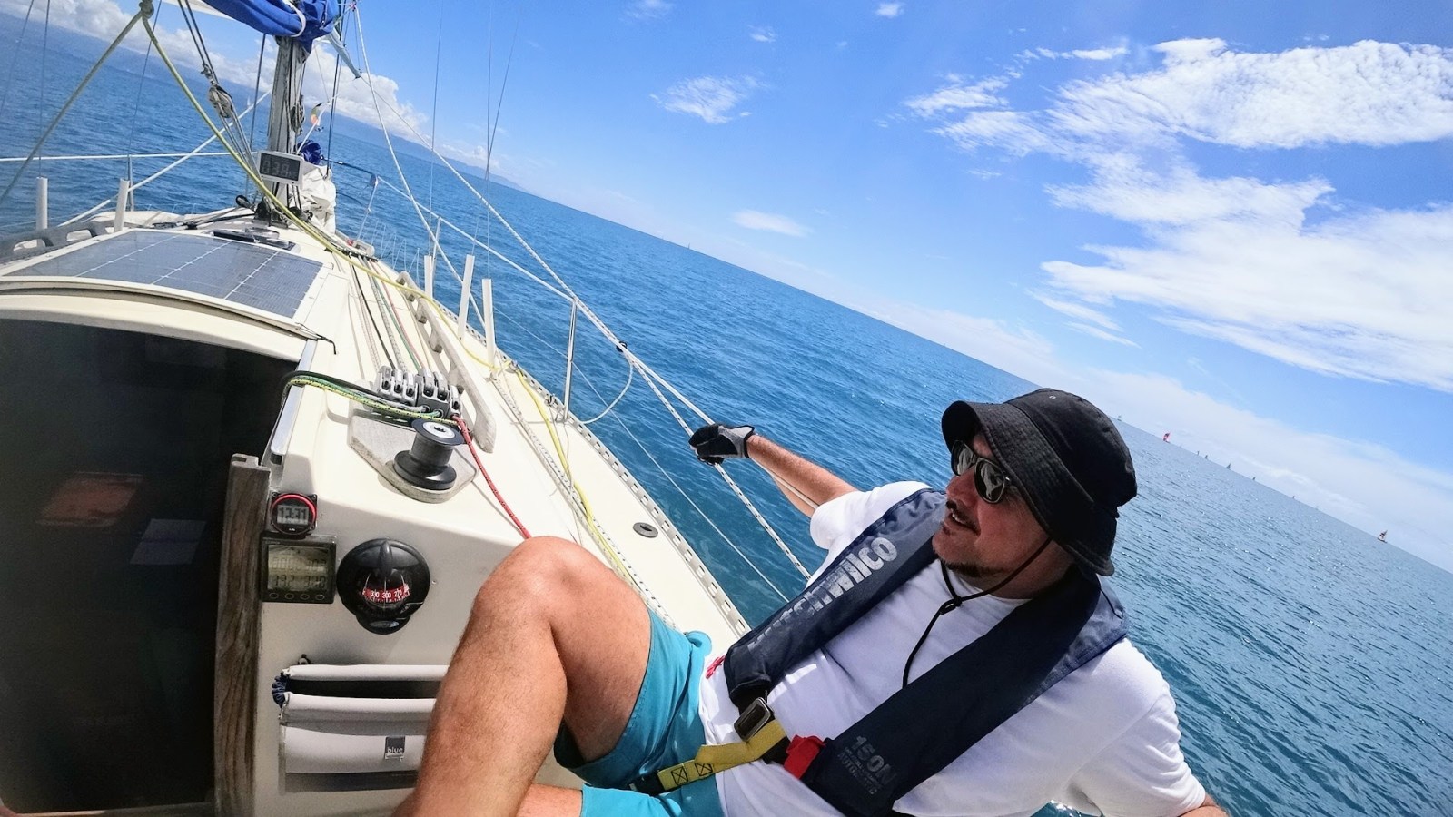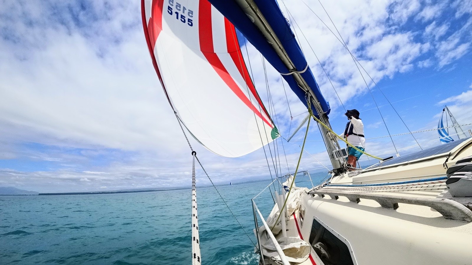 Once we were heading downwind we poled out the jib, hoisted the genoa as a second headsail, and shook out the reef.