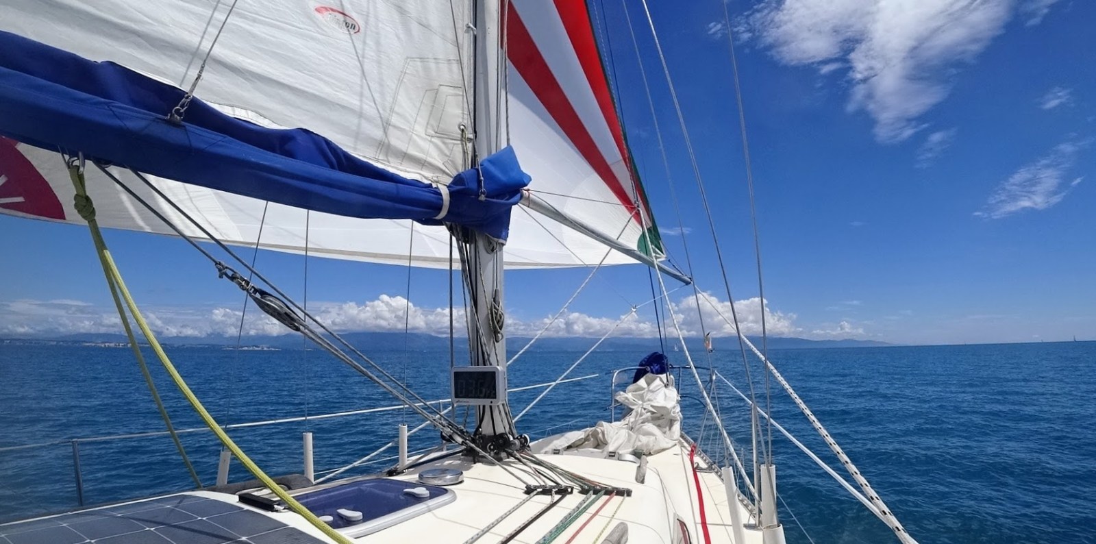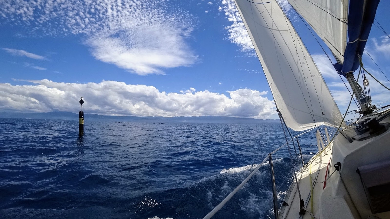 As we neared the border of the mussel farm the wind had backed to NE. We dropped the spinnaker and went back to sailing close-hauled with the genoa. Anastasia took a turn on helm and Tunch prepared lunch. The mussel farm limits were well signposted with east cardinal markers