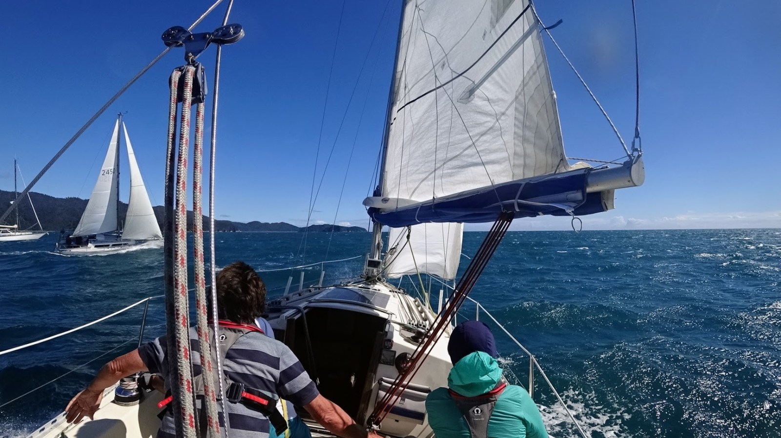 It was blowing 15-20 kts northerly so we put a reef in the main with the no. 3 jib. We timed the start pretty well we thought, just behind Roma over the line. The Committee Boat then called on ch. 77, two boats were over the line (OCS). They didn’t identify the boats. It was obviously not us, so we thought, so we continued on our merry way.