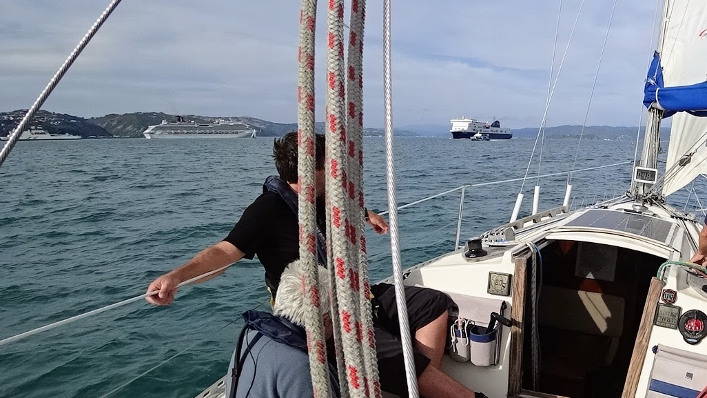 We cast off at 1730 hrs with Murray on helm, John and Geoff on sail trim with newbie Ildomar assisting. The course was announced on ch. 62 as Start – mark #25 Shoal Pile – mark #4 Ngauranga – mark #16 Oriental Bay – Finish. We called in to confirm Halo was racing with 4 POB. After hoisting the sails we did a quick practise sail. Fairly busy shipping in the harbour with the Kaitiaki and Connemara docking and the big cruise ship Carnival Splendor departing.