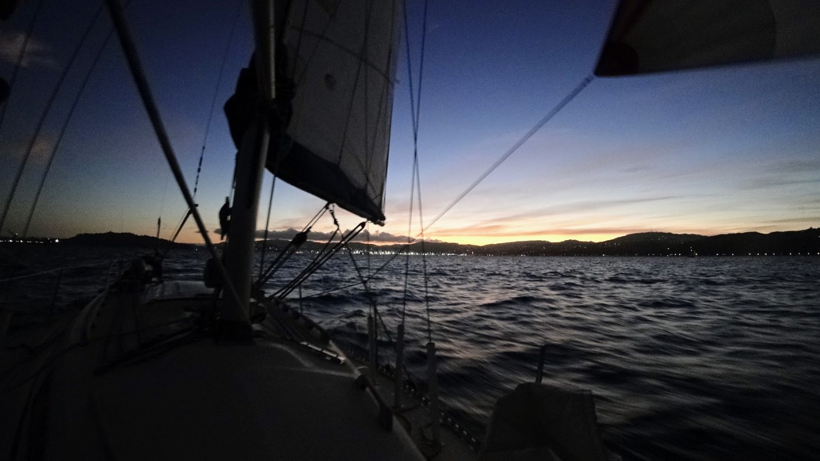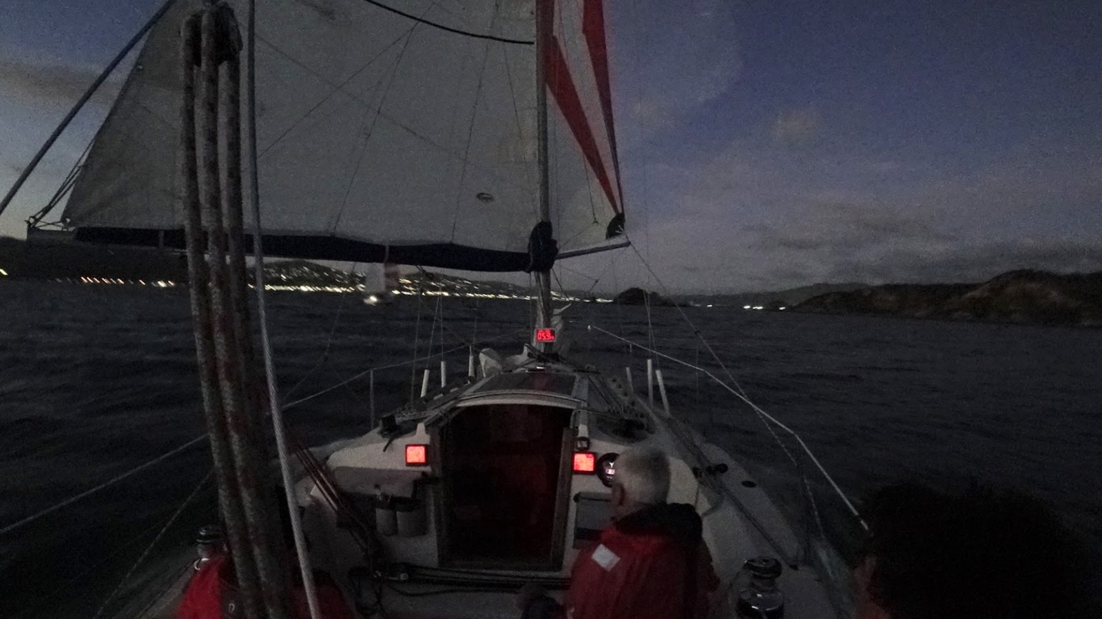 The sun was disappearing behind us over Wellington as we approached the top end of Somes. Tamerlane was close behind us. We hoisted our no. 1 genoa and dropped the spinnaker before rounding Mokopuna rocks at 1947 hrs.