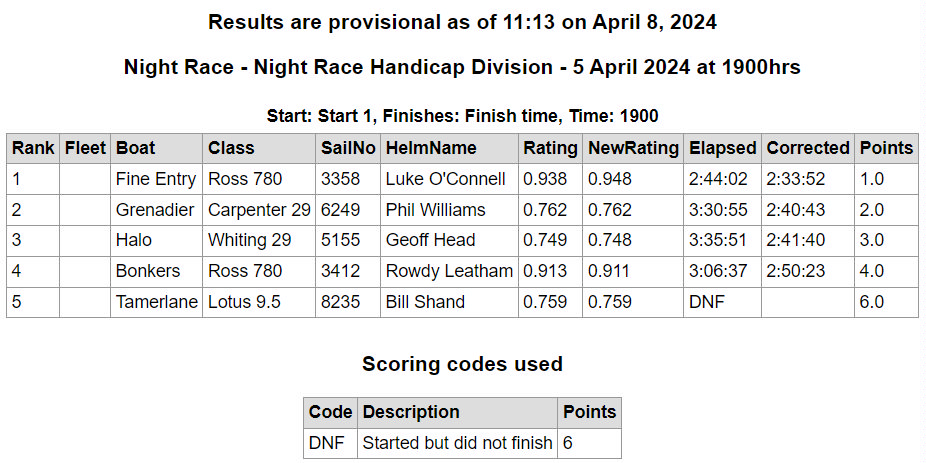 We rounded the Falcon Shoals light at 2118 hrs. As we sailed on a broad reach towards Kau Bay the wind was dying out and we slowly caught up with and passed Tamerlane before rounding Point Halswell at 2155 hrs. It was then a very slow beat down Evans Bay with only 3 kts of wind. The finish was a line between the Shoal Pile and the committee boat Pania with Neil recording the times. Halo crossed the finish at 2235 hrs.