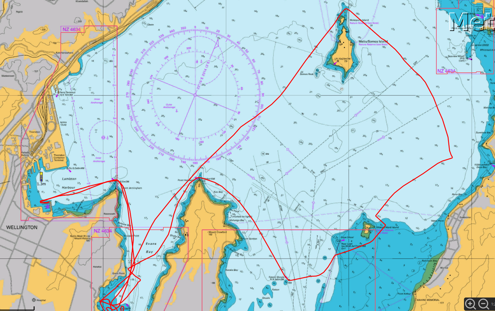 We beat our way across the harbour towards Eastbourne in about 8 kts of southerly. We were getting good lift so continued on until eventually tacking off Days Bay. Then it was two more short tacks before rounding the bottom of Ward Island at 2057 hrs.
