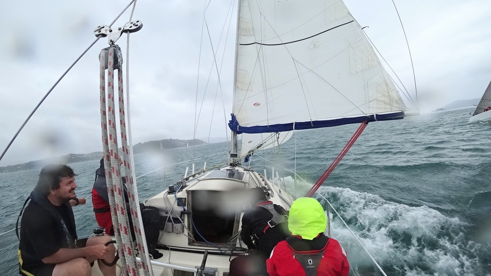 It was now a fast and furious broad reach back towards Pt. Halswell in the the heavy rain that started bucketing down. Slingshot quickly sailed past us.