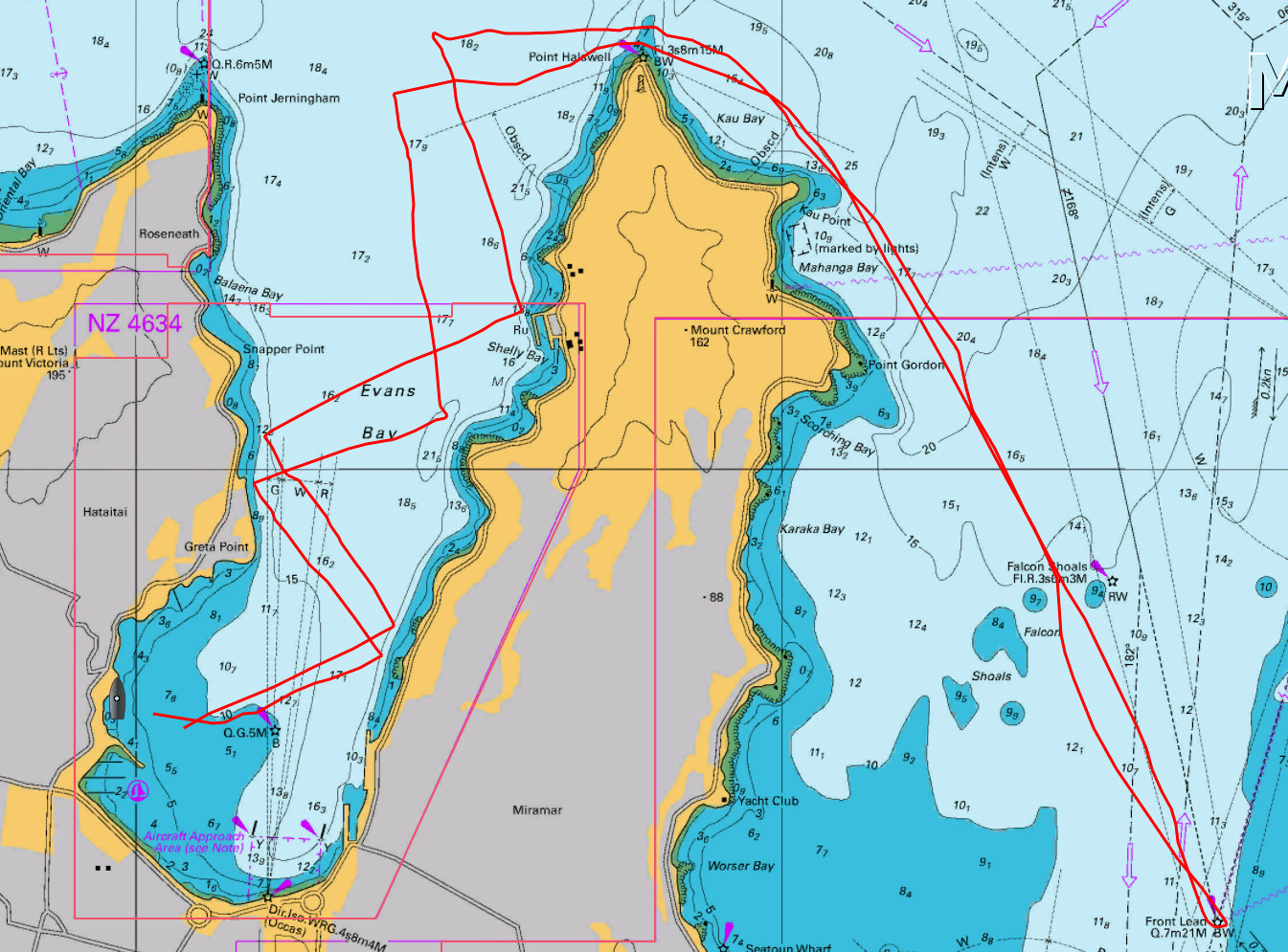 We now headed towards the next mark, the Number One Leading Light. John took over on helm as Jamie hoisted our medium spinnaker. We were now on a reach once we passed Kau Point and continued to pull ahead of the boats behind us. Slingshot sailed over towards Worser Bay for some reason and Incantare appeared to be heading towards Falcon Shoals light.