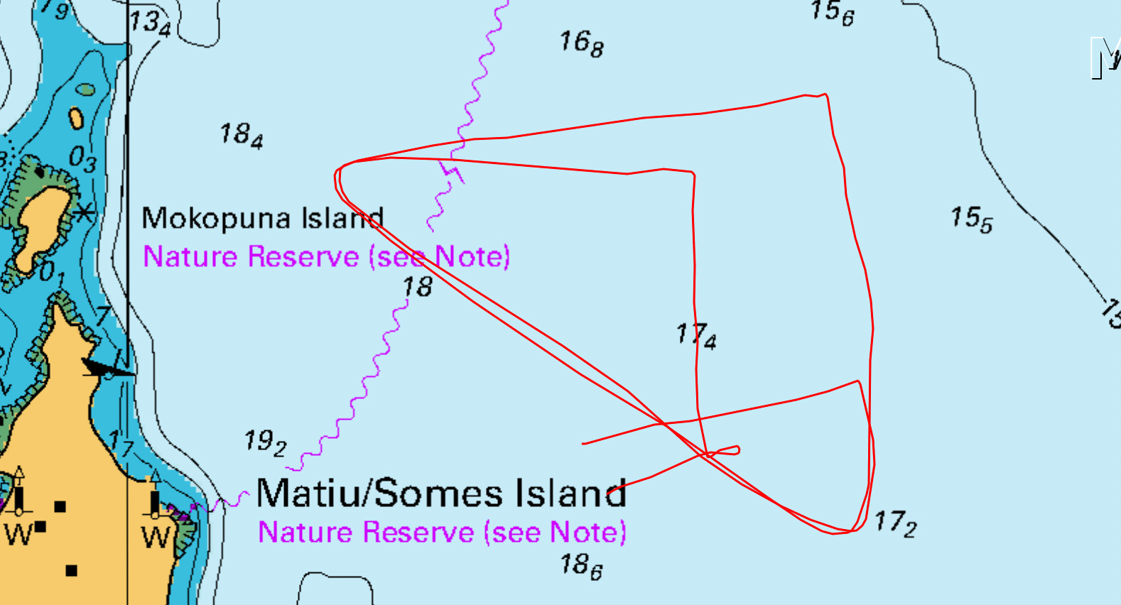 By now the wind had died out completely so we waited while the race committee looked for wind. It looked like there was some breeze down towards the harbour entrance past Ward Island. We drifted listlessly around and enjoyed the opportunity for lunch and refreshments.
