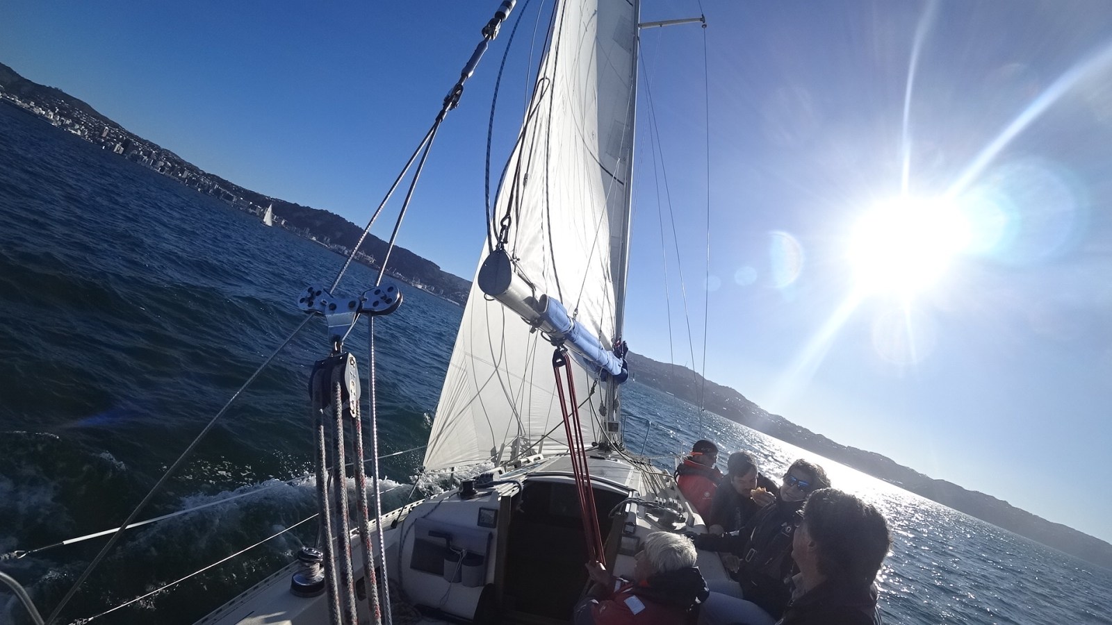 Our anemometer at the top of the mast has been recently re-mounted and is now providing accurate wind data to our big display on the mast. It was certainly useful to have this always visible to the helmsman and we found that about 30 degrees apparent angle to the wind seemed to be optimum for sailing close hauled in these conditions.