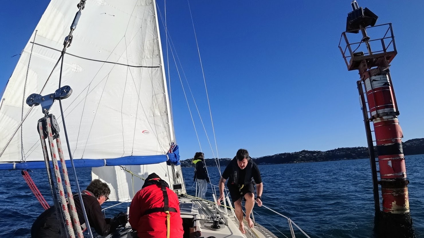 After prepping the boat we cast off at 1116 hrs and did some practice tacks with our repaired heavy no. 1 genoa and full main. The northerly was about 10 kts but up to 15 kts at times. We sailed past the Port Nic clubhouse to see today’s course number. Number 44: SR … 25P… 11S … 10S … FR. Crew positions were: John and Jamie on sail trim, Juliette on bow, Murray on mainsheet and me on helm. We did a practice approach to the start line. Almost two minutes from the east edge of Glasgow wharf.