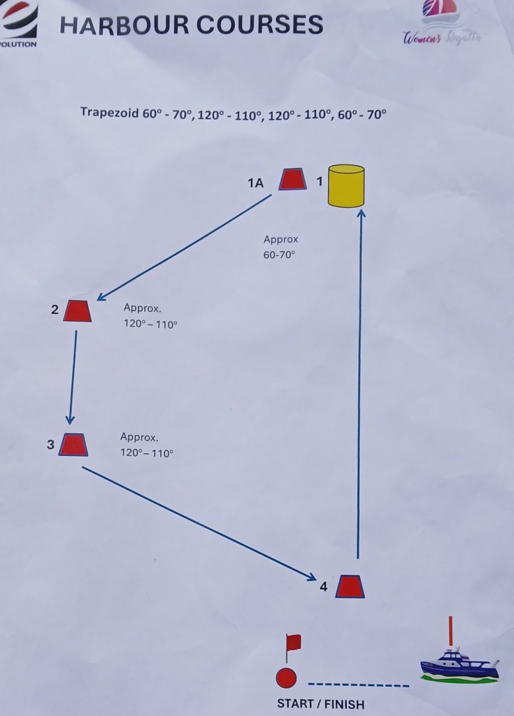 We went down to the boat. Marion conducted the Crew Safety/Departure briefing and allocated crew positions: Marion on helm, Funny on bow, Helen and Leah on sail trim, Juliet on mainsheet. We put up our fluro yellow division flag. Murray took a crew photo and then we cast off at 0930 hrs.