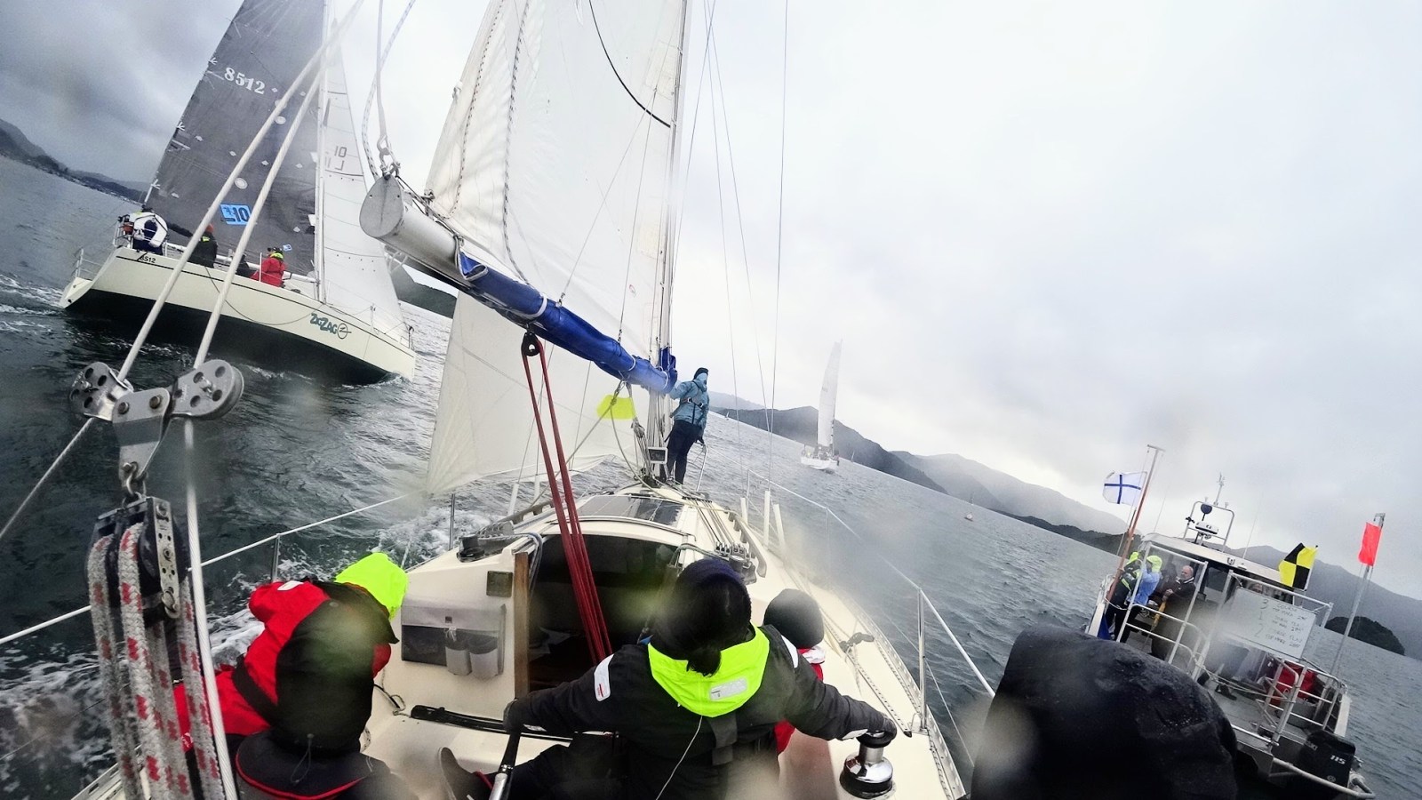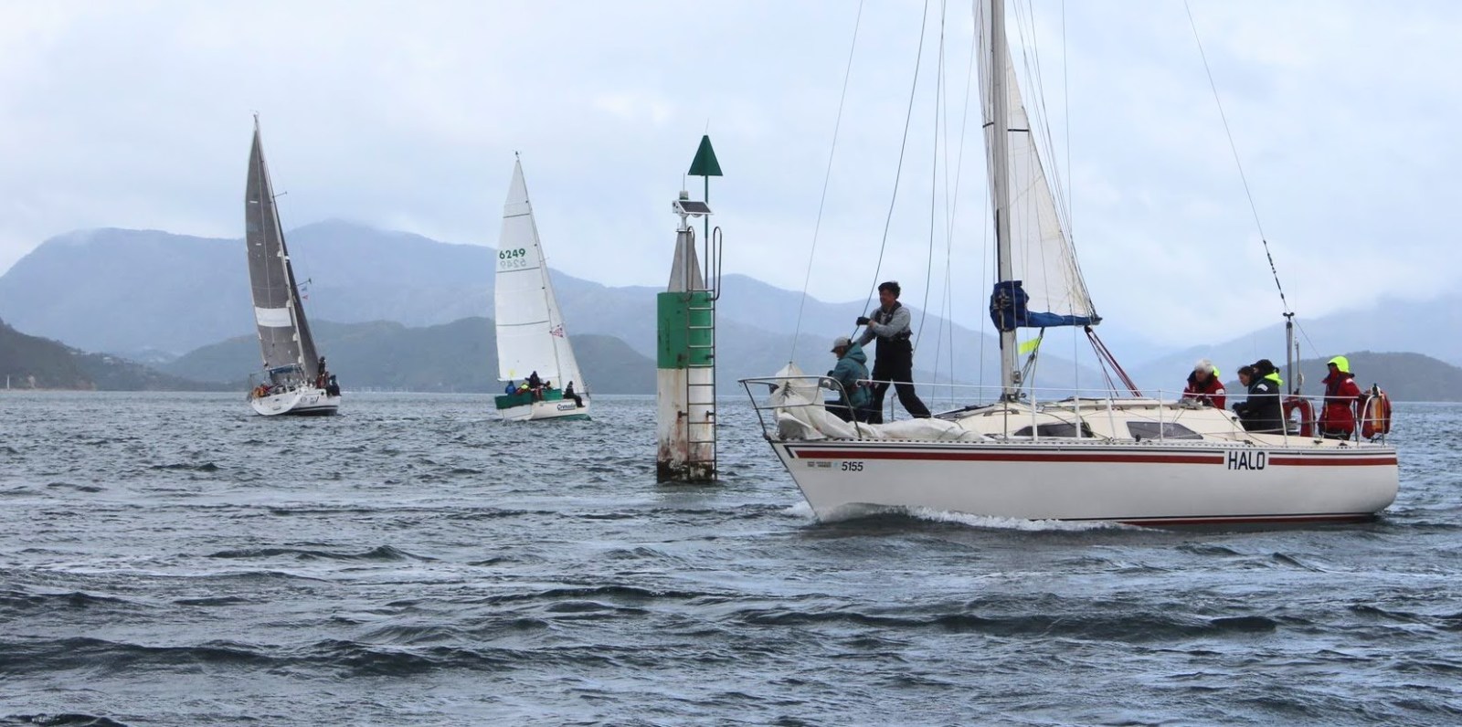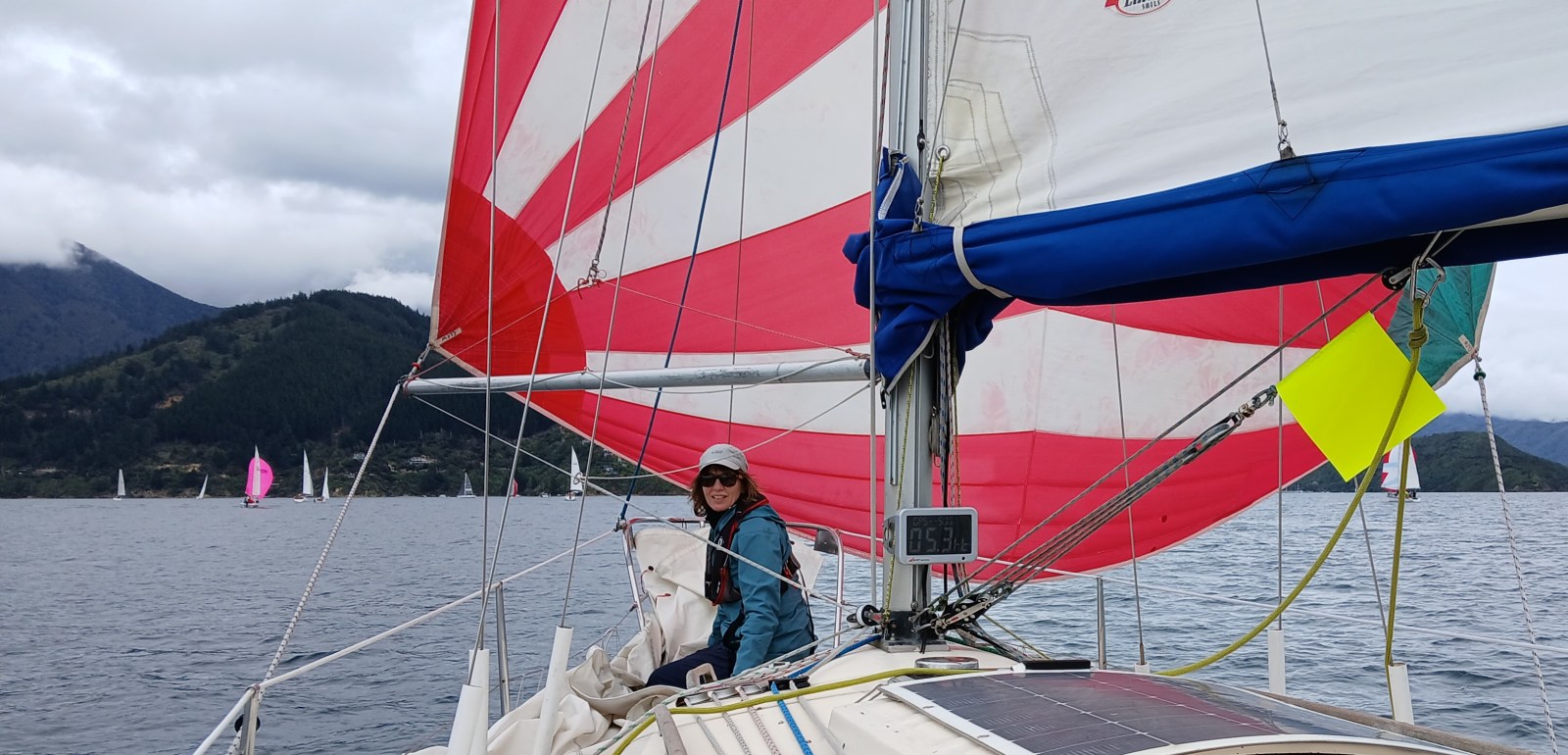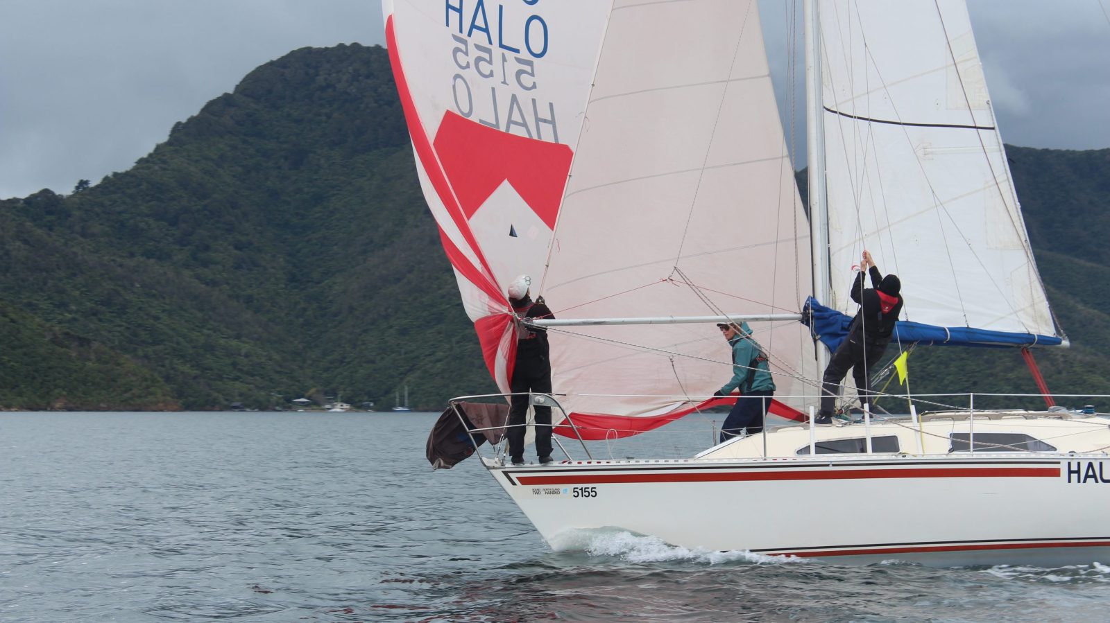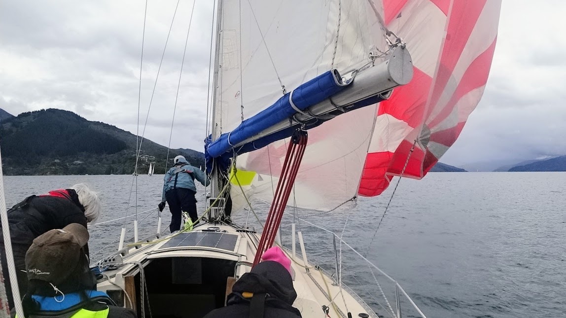The course was announced: Start – Perano Shoal – Luke Rock – Finish. The committee boat was Ray White. It was a blustery southerly (!) out in Queen Charlotte Sound so we conservatively rigged the no. 3 jib and a reef in the mainsail and the medium spinnaker for a downwind start.