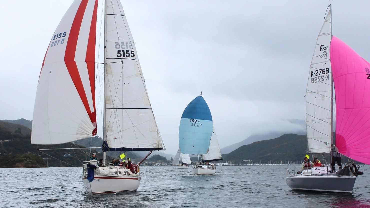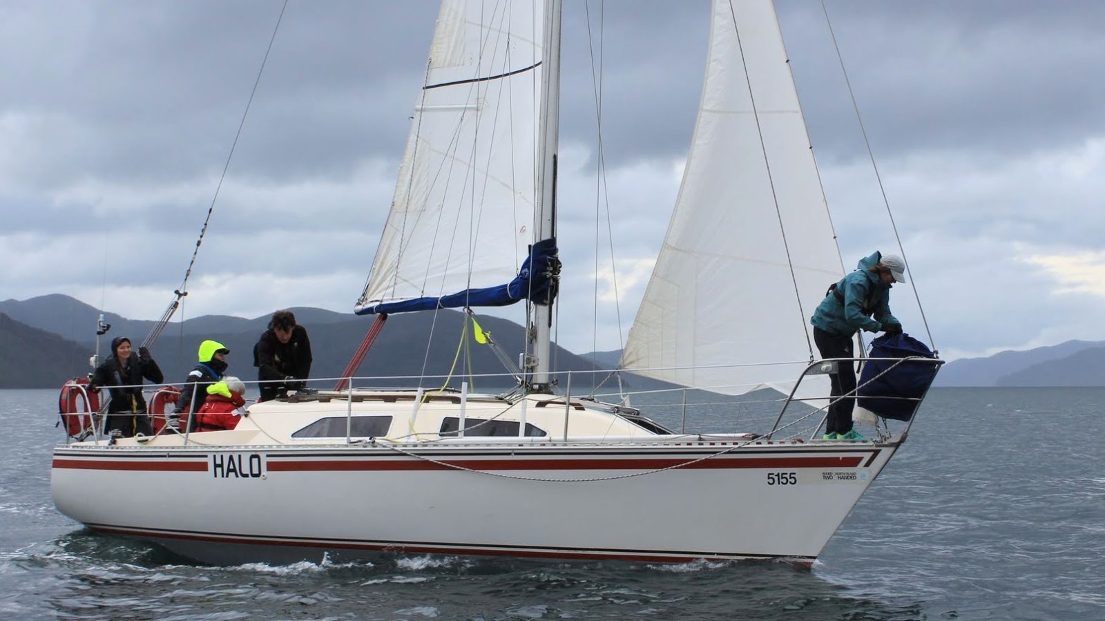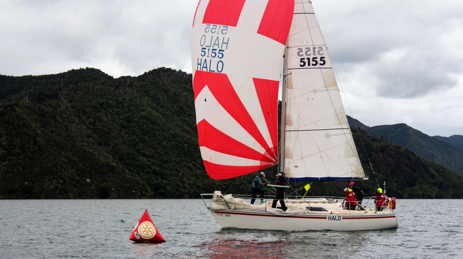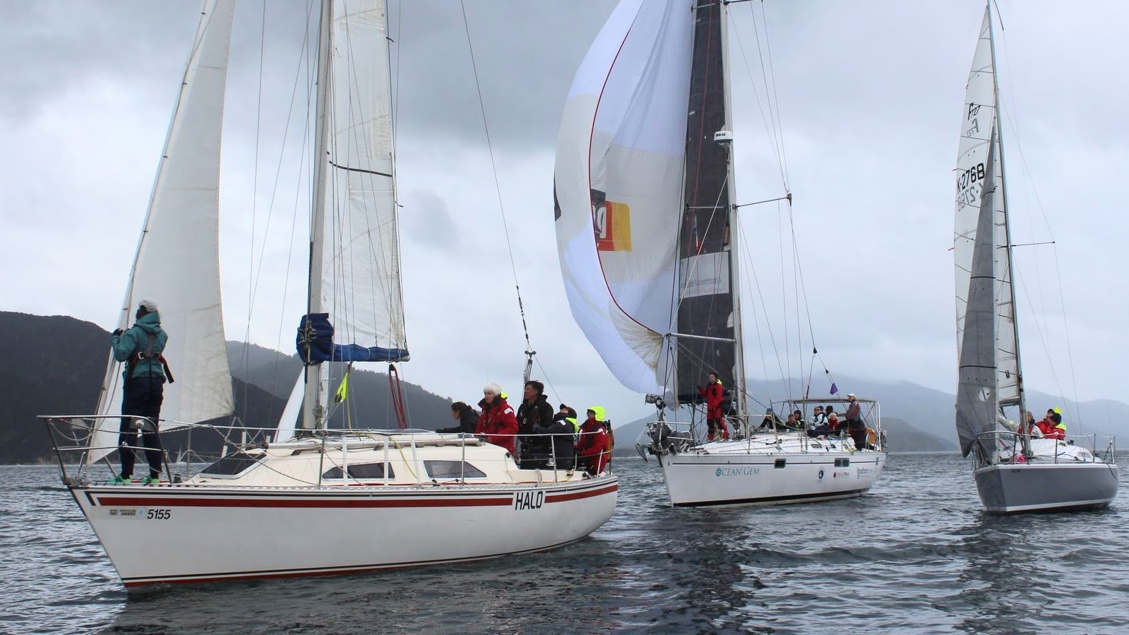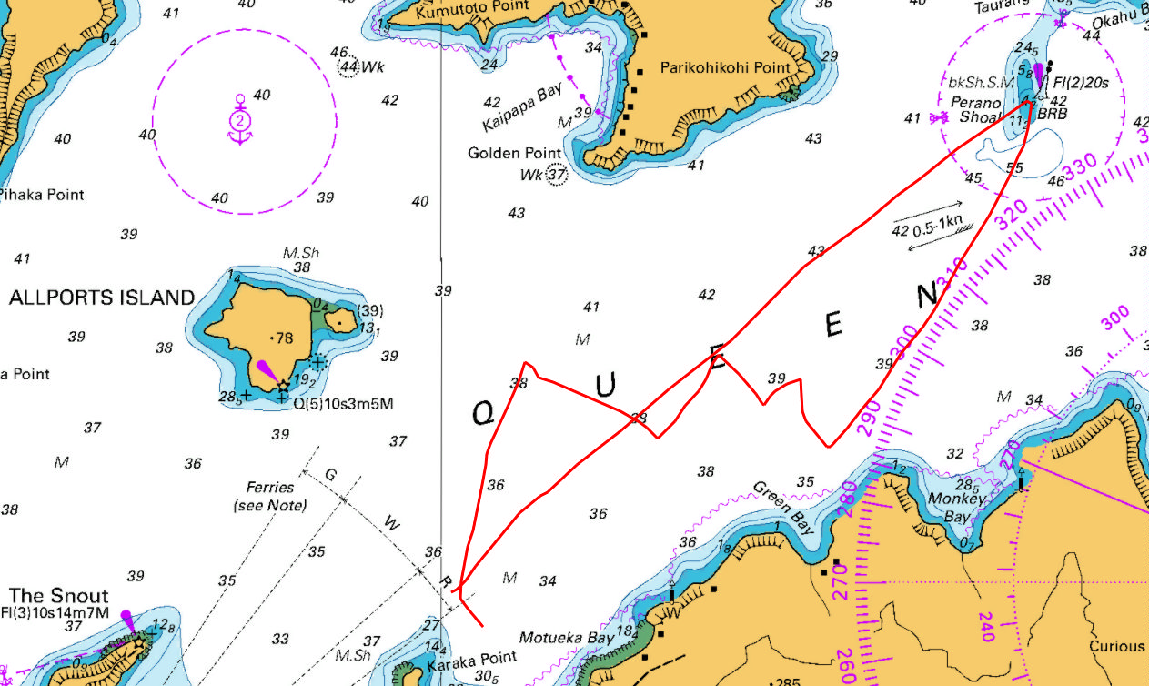 The course was announced: Start – Perano Shoal – Luke Rock – Finish. The committee boat was Ray White. It was a blustery southerly (!) out in Queen Charlotte Sound so we conservatively rigged the no. 3 jib and a reef in the mainsail and the medium spinnaker for a downwind start.