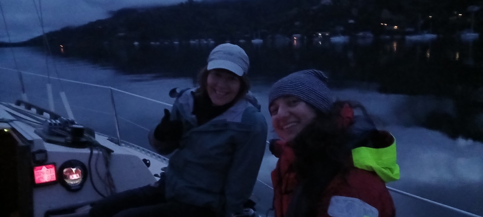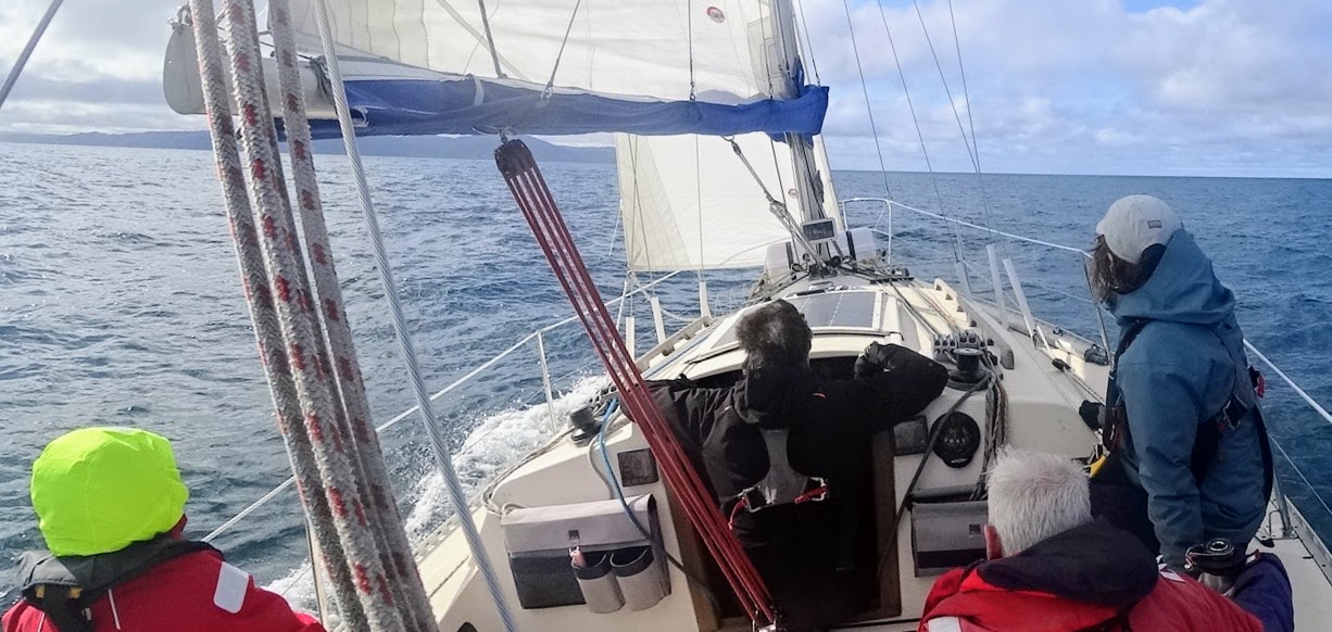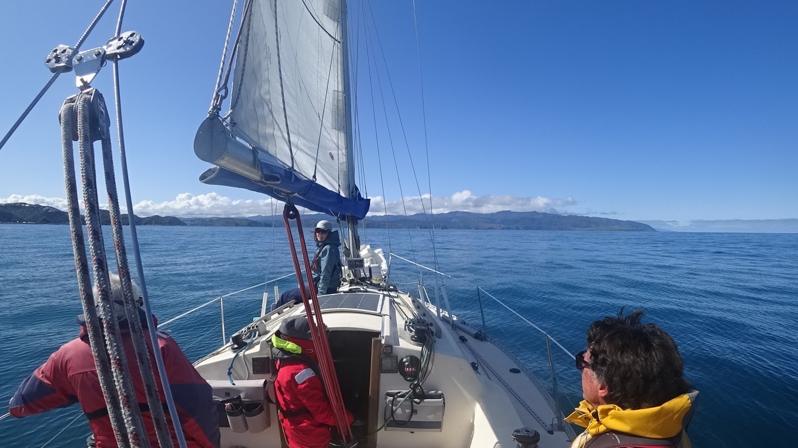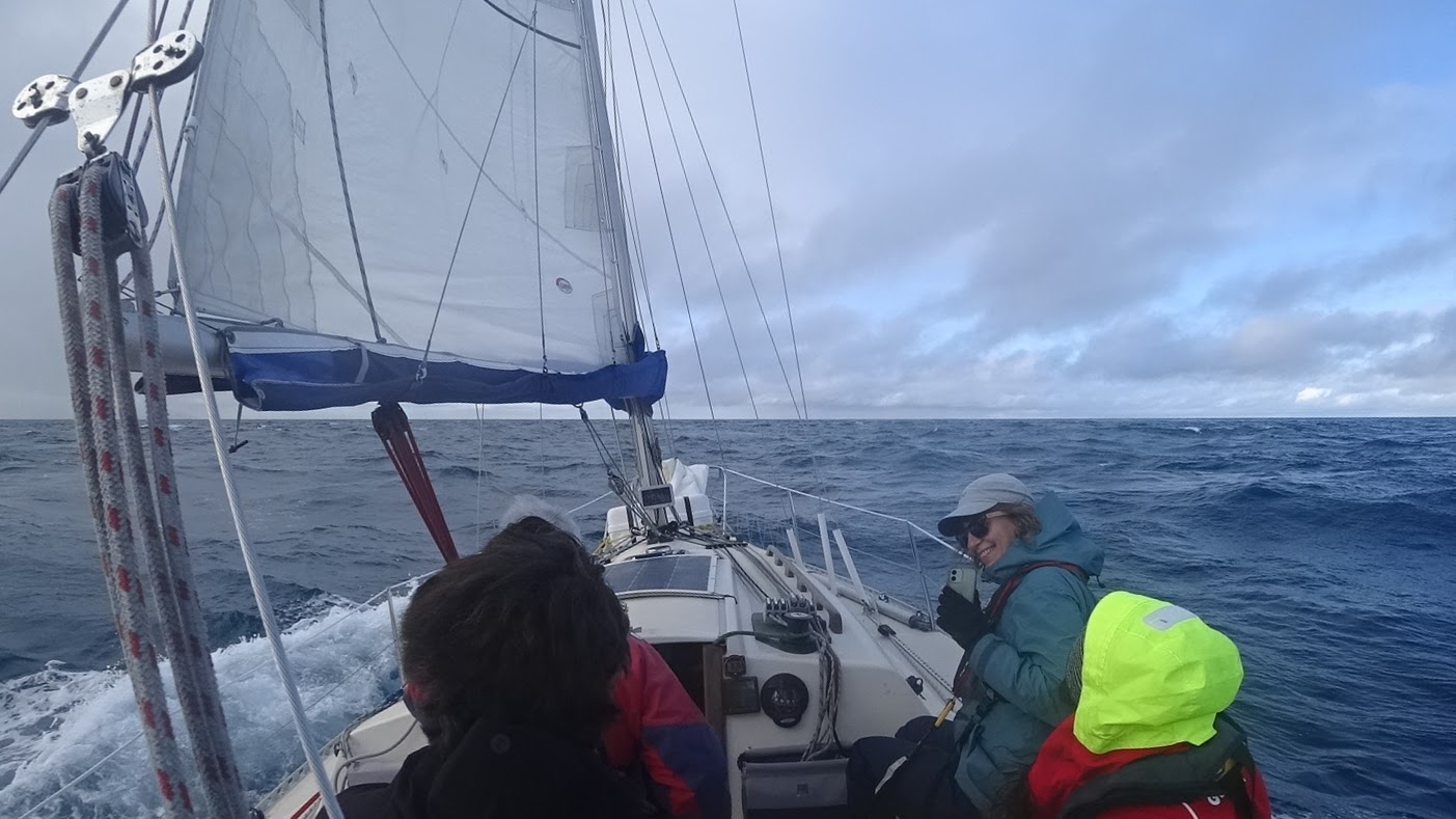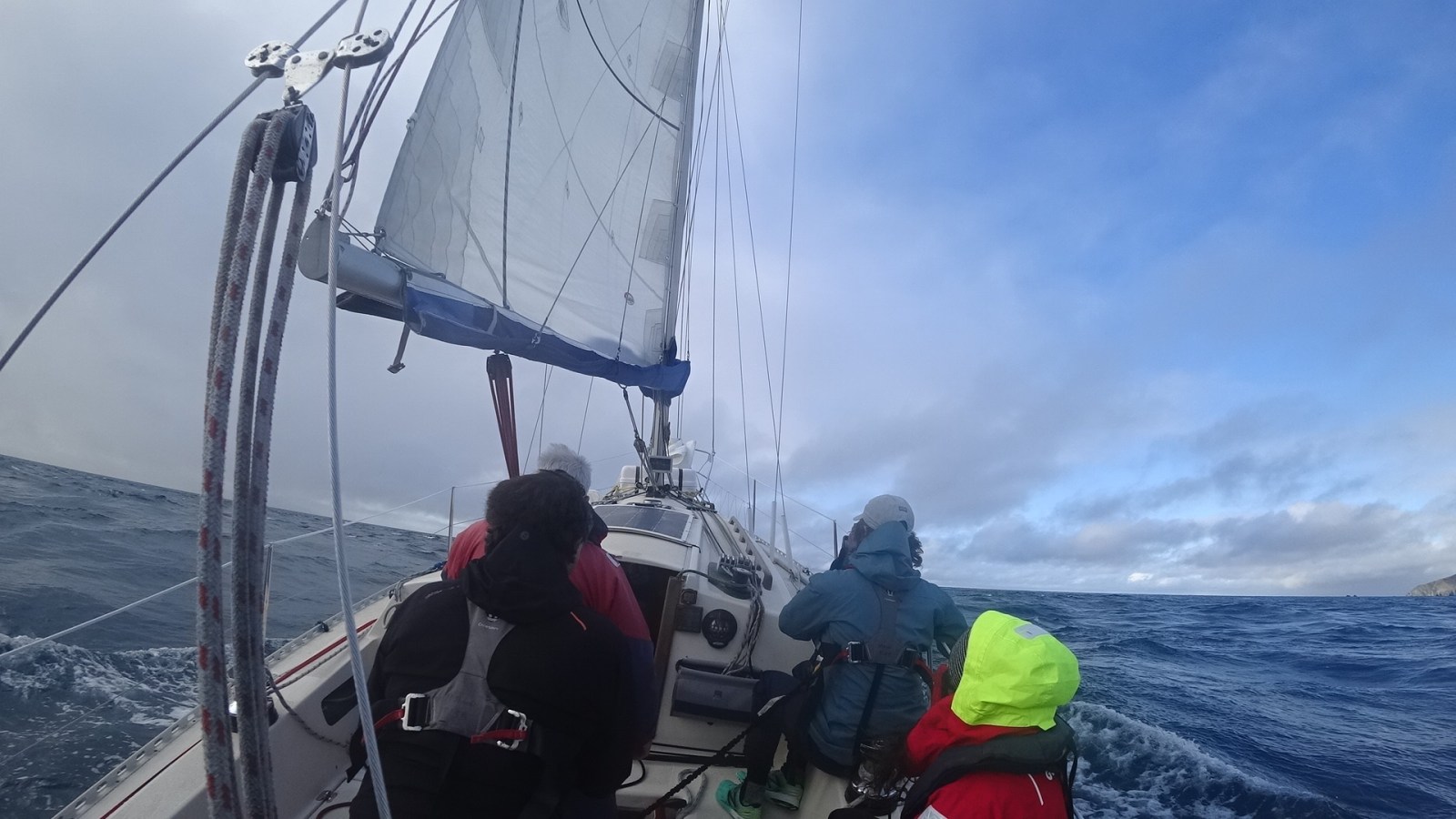 After a few more minutes bouncing around in the rip the sea state settled down. The wind was a light southerly on our starboard beam. Funny and Leah hoisted the jib although we still needed to keep the engine running to maintain our target speed.