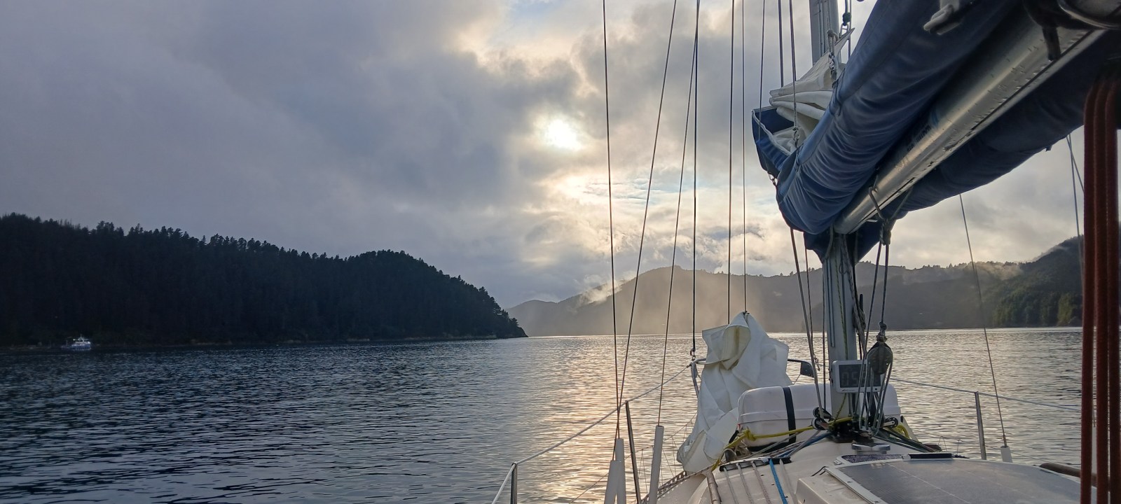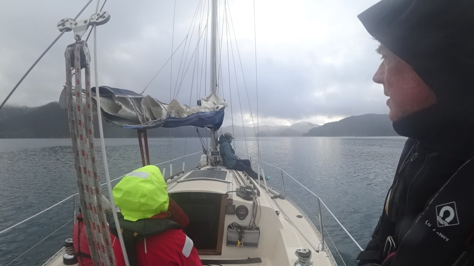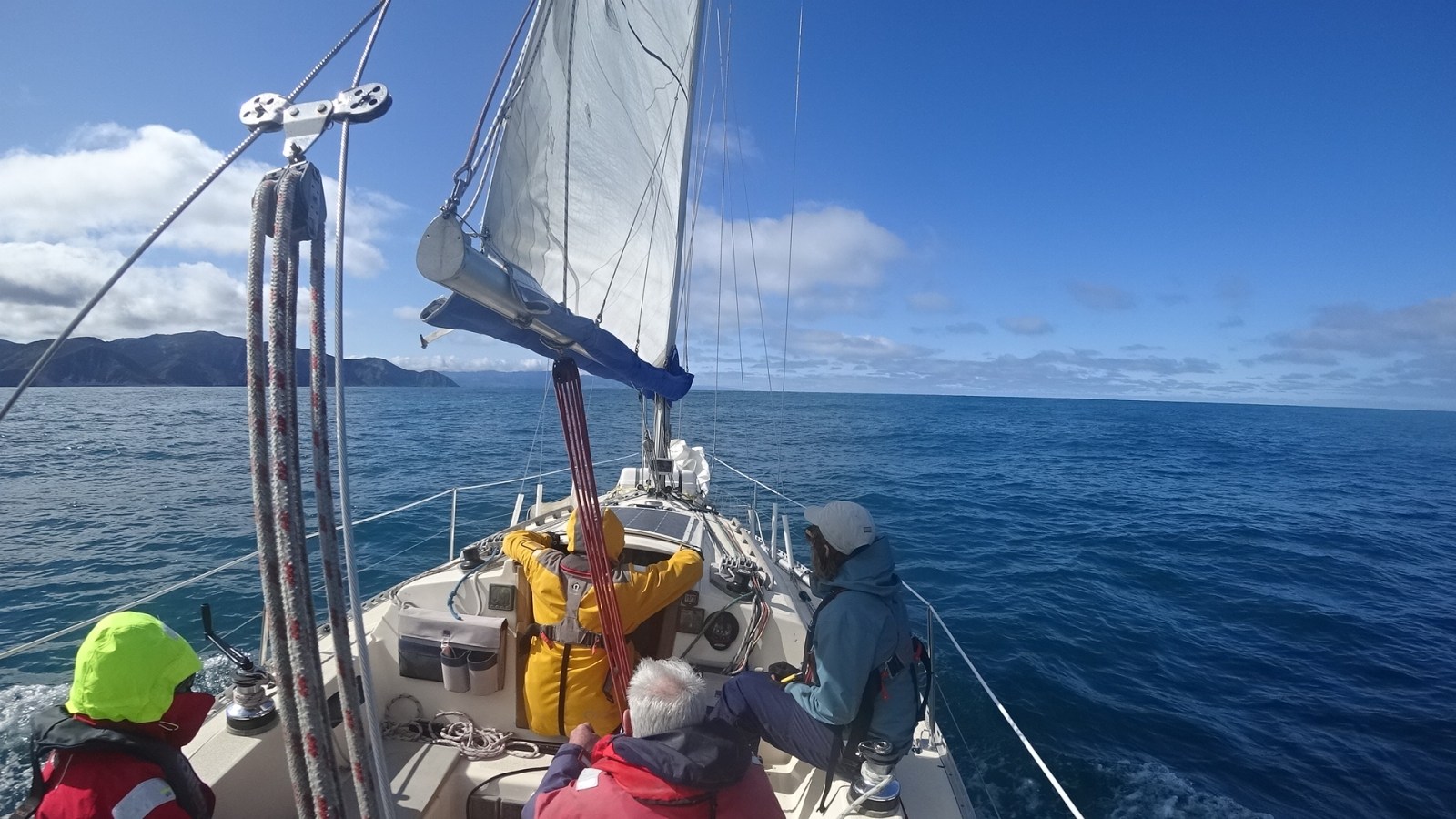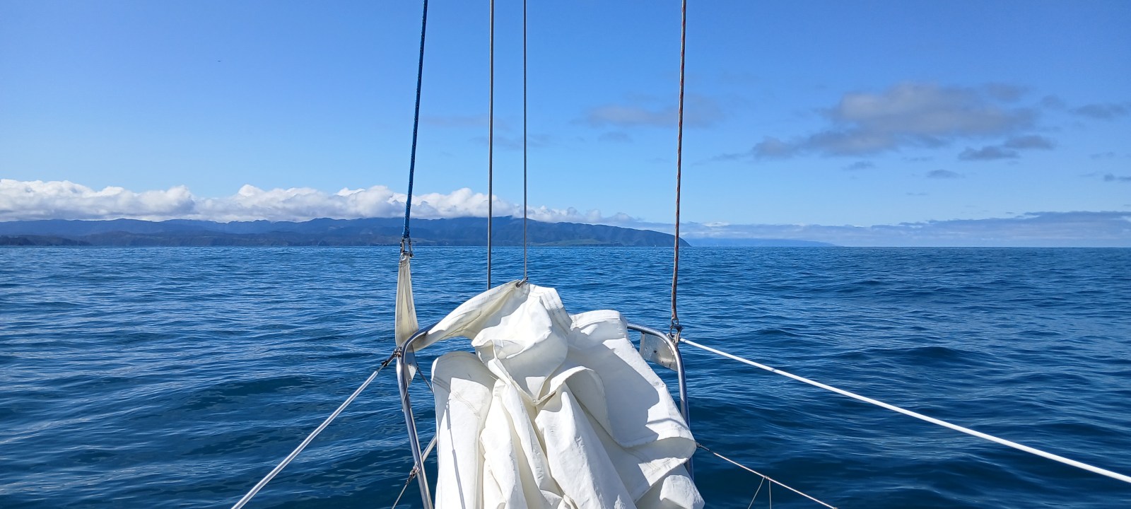 The cloud cleared for a beautiful day in Cook Strait. The light breeze on our nose meant the jib wasn’t helping so we dropped it and continued motoring.