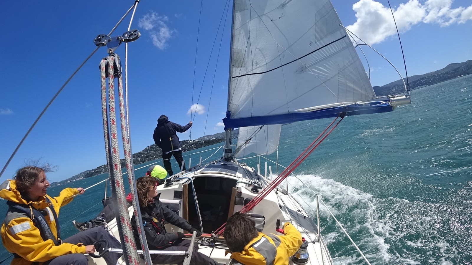 After a few laps around Lambton Harbour we set sail past Pt Jerningham into the full force of the southerly. Stronger but less gusty. We got up to 7 kts boat speed at times as we crossed the top of Evans Bay.