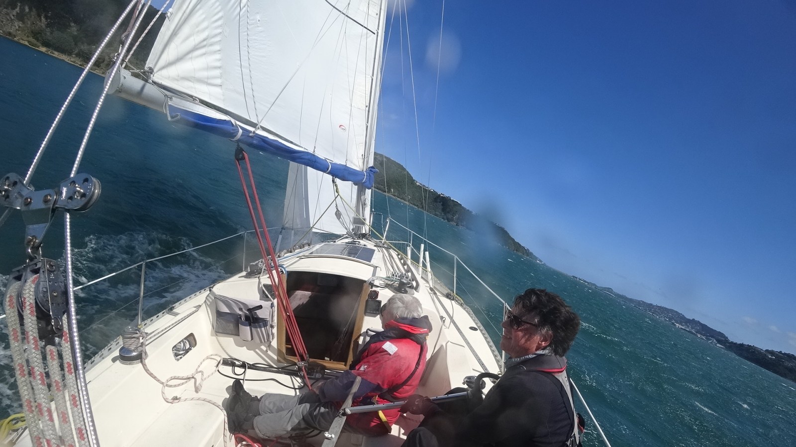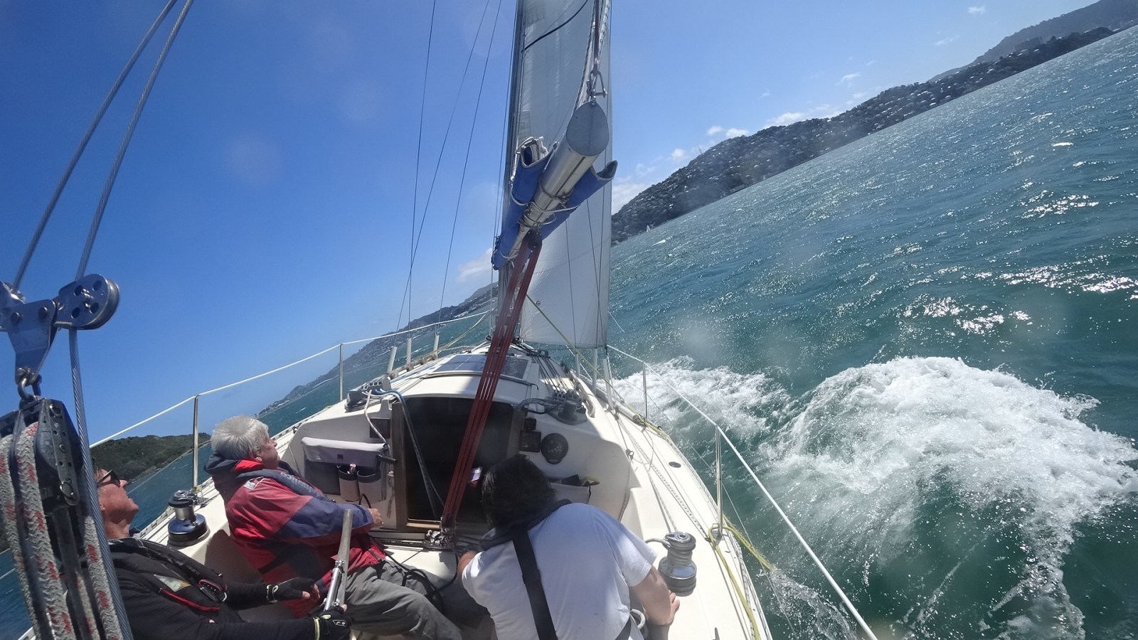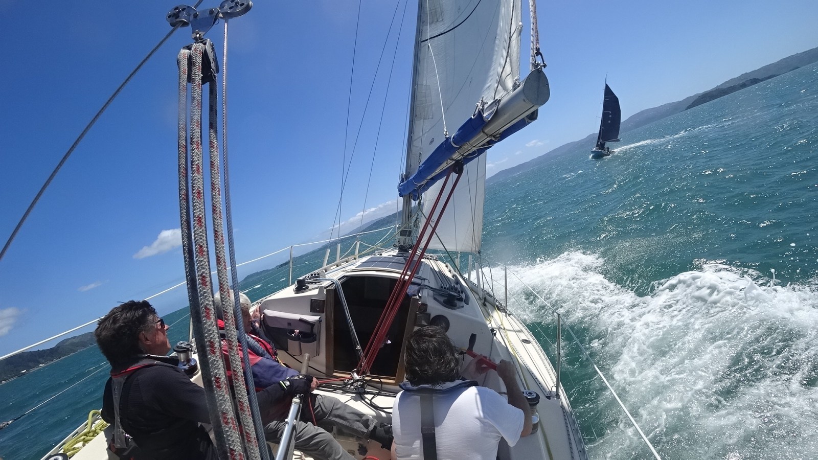 We then sailed on a beam reach across the harbour towards Pt Halswell. The wind was 20-25 kts. It would have been nice to have the reef back in the mainsail but decided not and followed Tamerlane and Upcycled to the point.