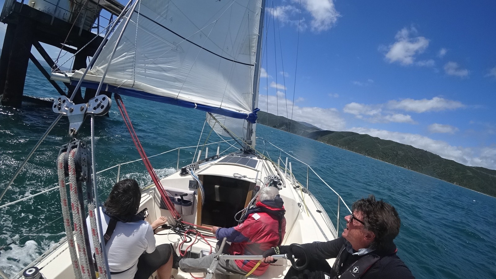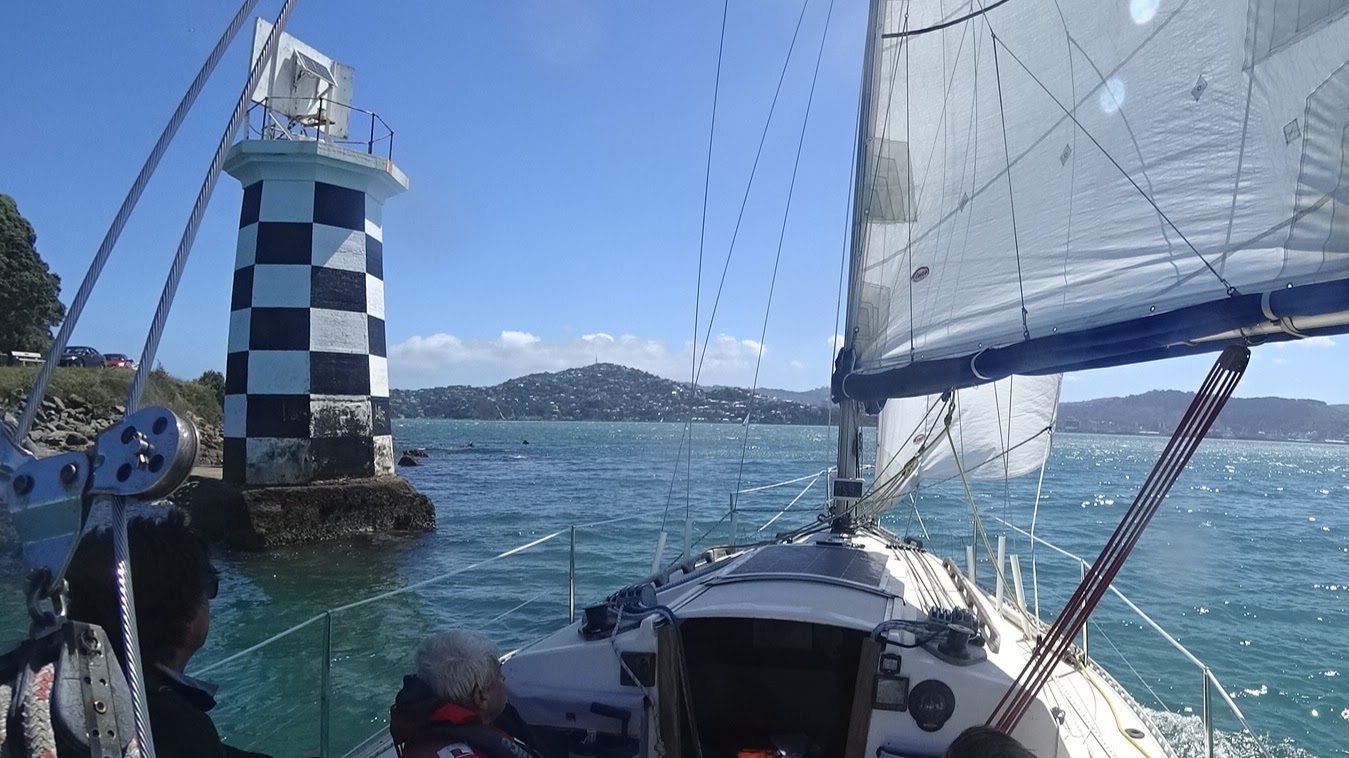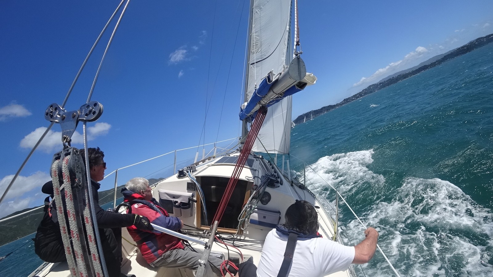 We then sailed on a beam reach across the harbour towards Pt Halswell. The wind was 20-25 kts. It would have been nice to have the reef back in the mainsail but decided not and followed Tamerlane and Upcycled to the point.