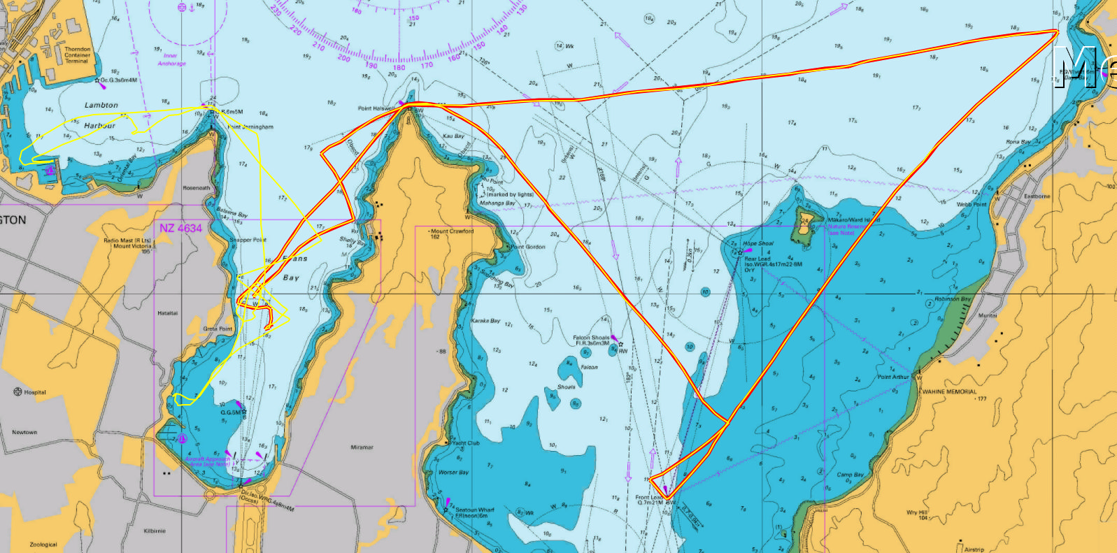We came in as close as we dared to Point Halswell but Grenadier passed us as we entered Evans Bay. To avoid their wind shadow we tacked away.
