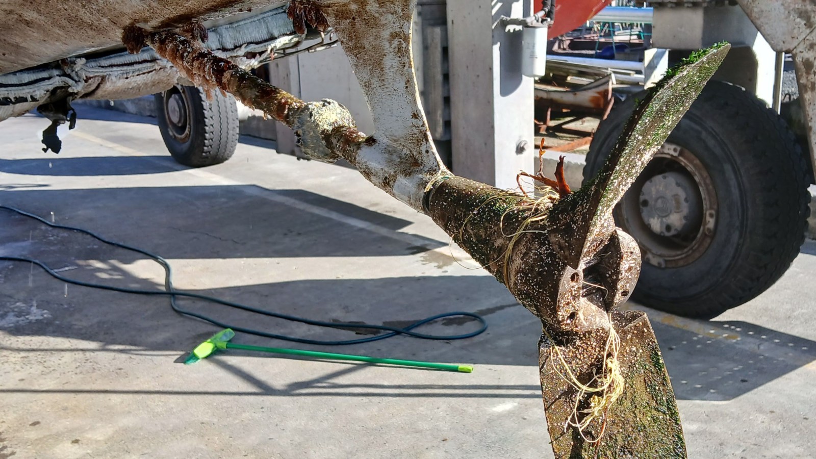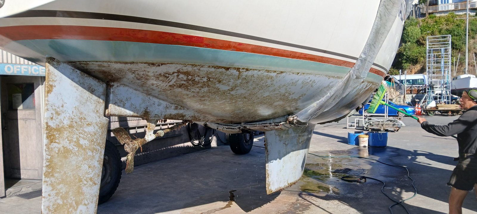 I carefully edged Halo on to the strops and then Sven hauled us out of the water. The hull was fairly dirty which was to be expected since the last bottom clean in November. The zinc anode on the prop shaft still had plenty of life in it. The only concern was some fishing line wound around the prop.